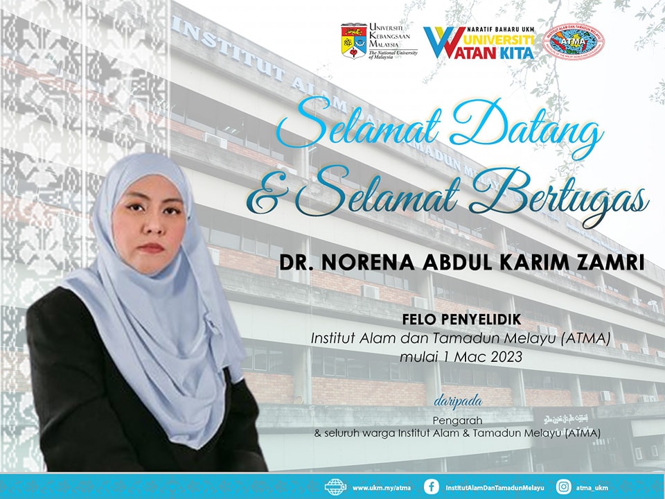 Sekalung tahniah diucapkan kepada Dr. Norena Abdul Karim Zamri atas pelantikan sebagai Felo Penyelidik di ATMA mulai 1 Mac 2023.