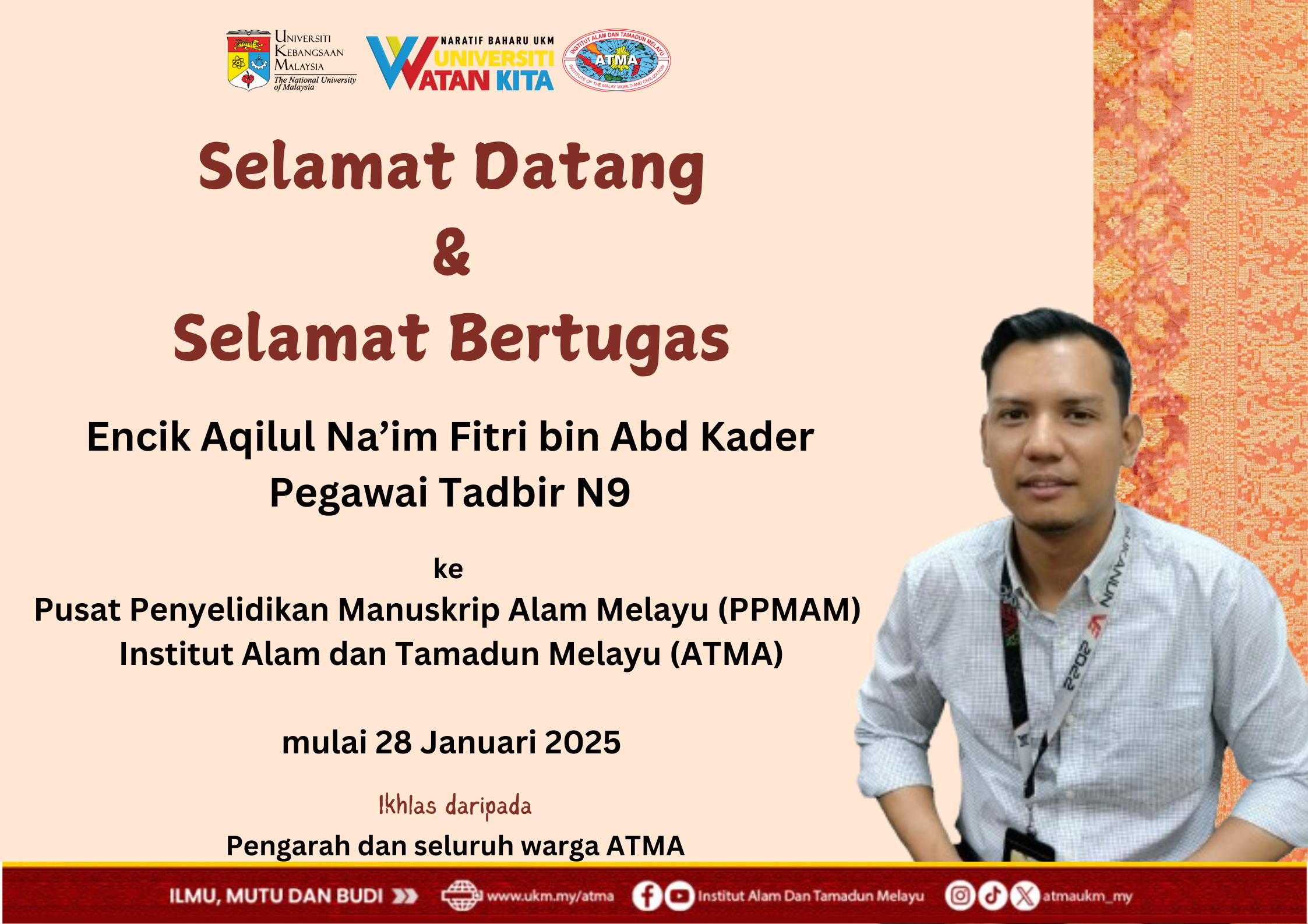 ATMA mengucapkan selamat datang dan selamat bertugas kepada Encik Aqilul Na’im Fitri bin Abd Kader, Pegawai Tadbir N9, yang kini bertugas di Pusat Penyelidikan Manuskrip Alam Melayu (PPMAM), ATMA mulai 28 Januari 2025.