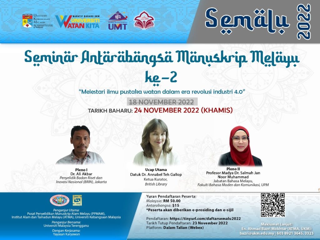 Sukacita dimaklumkan bahawa terdapat penukaran tarikh penganjuran Seminar Antarabangsa Manuskrip Melayu Kali ke–2, 2022 (SEMALU II) kepada tarikh baharu: