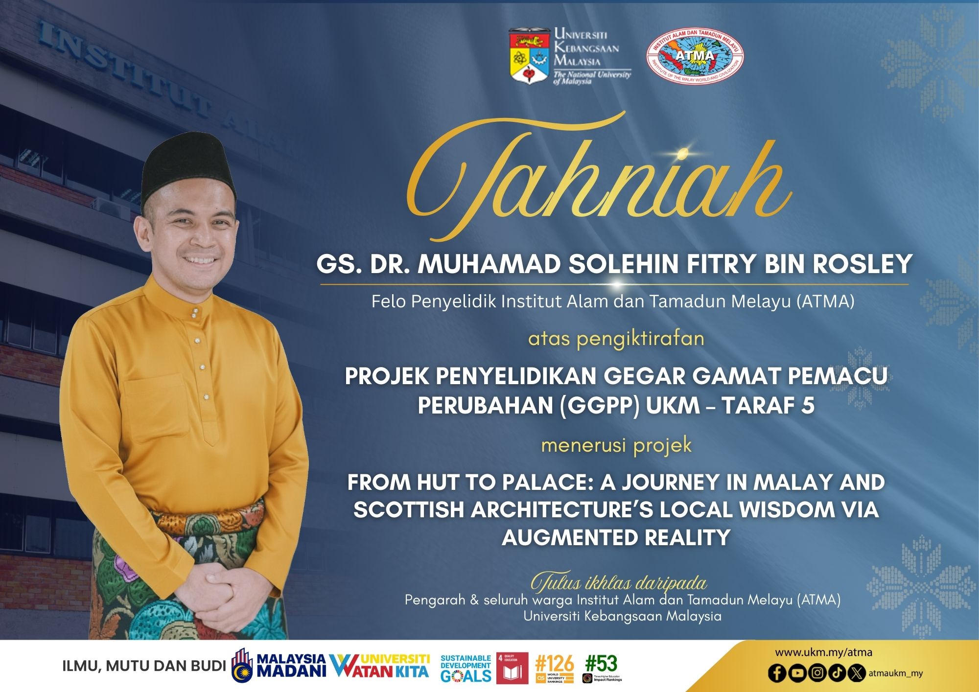“From Hut to Palace: A Journey in Malay and Scottish Architecture’s Local Wisdom via Augmented Reality” yang memperlihatkan integrasi inovatif antara kearifan tempatan, seni bina dan teknologi realiti terimbuh.