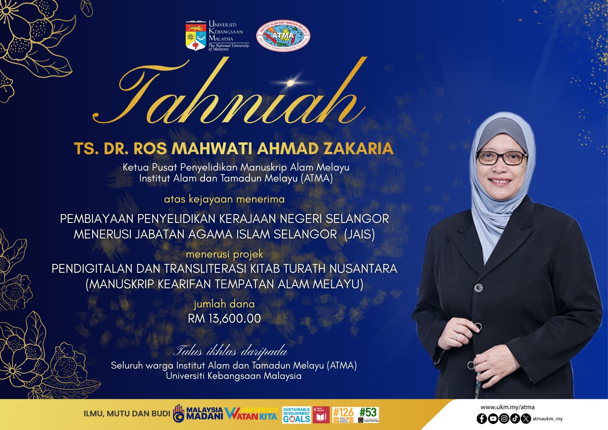 Tahniah diucapkan kepada TS. Dr. Ros Mahwati Ahmad Zakaria, Ketua Pusat Penyelidikan Manuskrip Alam Melayu, ATMA atas kejayaan menerima pembiayaan penyelidikan Kerajaan Negeri Selangor melalui Jabatan Agama Islam Selangor (JAIS) bagi projek Pendigitalan dan Transliterasi Kitab Turath Nusantara (Manuskrip Kearifan Tempatan Alam Melayu).