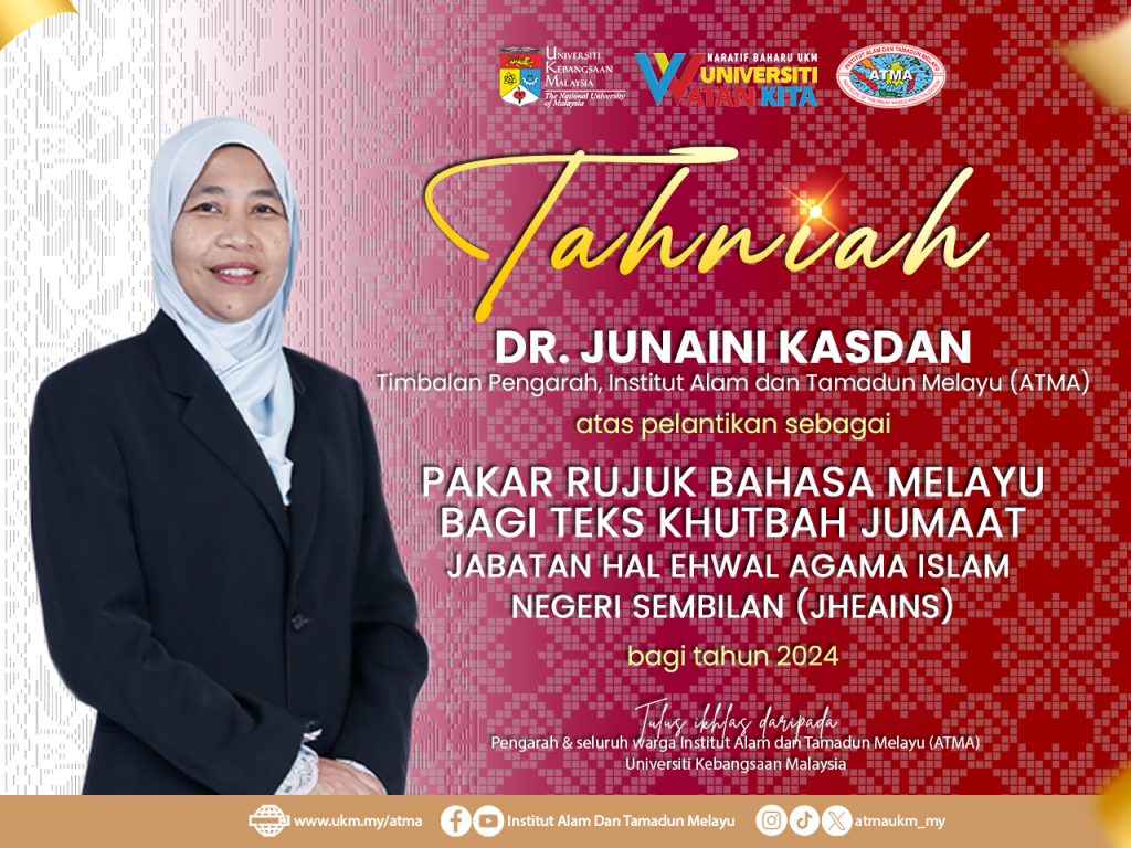 Dr. Junaini Kasdan, Timbalan Pengarah, Institut Alam dan Tamadun Melayu (ATMA) atas pelantikan sebagai Pakar Rujuk Bahasa Melayu Bagi Teks Khutbah Jumaat Jabatan Hal Ehwal Agama Islam Negeri Sembilan (JHEAINS) bagi tahun 2024.