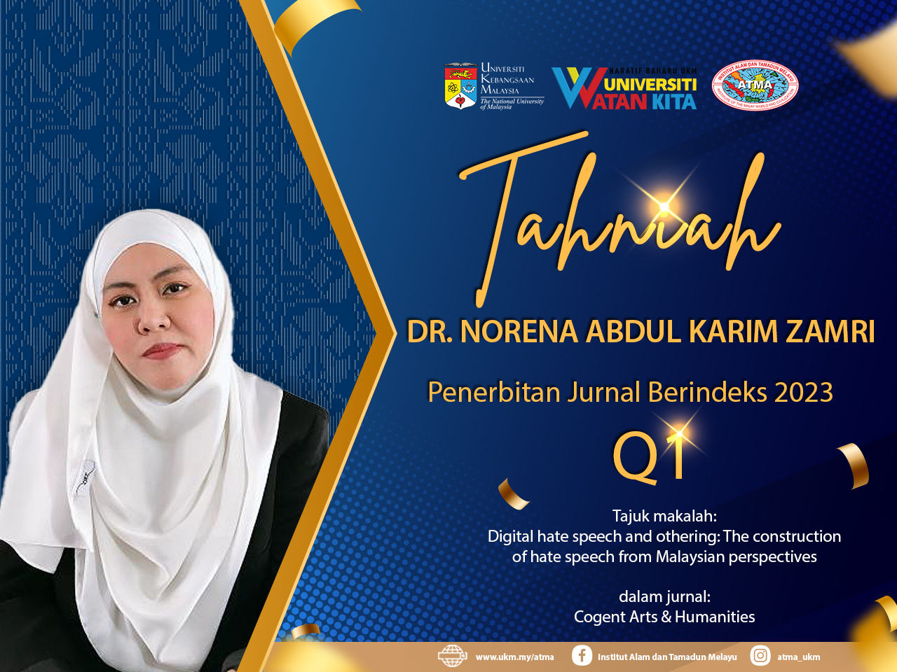 Syabas dan Tahniah diucapkan kepada Dr. Norena Abdul Karim Zamri, felo penyelidik ATMA atas penerbitan Jurnal Q1 dalam jurnal Cogent Arts & Humanities tahun 2023 bertajuk ‘Digital hate speech and othering: The construction of hate speech from Malaysian perspectives’.