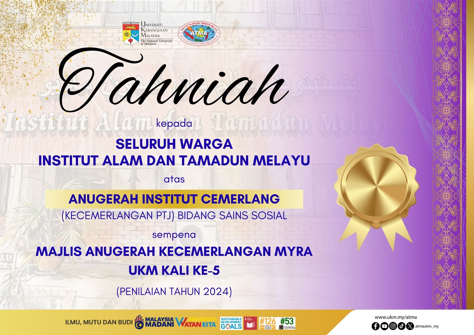 Tahniah diucapkan kepada seluruh warga Institut Alam dan Tamadun Melayu (ATMA) atas kejayaan menerima Anugerah Institut Cemerlang (Kecemerlangan PTJ) Bidang Sains Sosial bersempena Majlis Anugerah Kecemerlangan MYRA UKM Kali Ke-5 (Penilaian Tahun 2024).