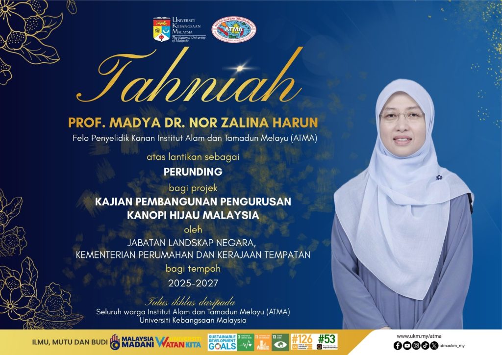 Institut Alam dan Tamadun Melayu (ATMA), Universiti Kebangsaan Malaysia, merakamkan ucapan tahniah kepada Prof. Madya Dr. Nor Zalina Harun atas pelantikan sebagai Perunding bagi projek Kajian Pembangunan Pengurusan Kanopi Hijau Malaysia oleh Jabatan Landskap Negara, Kementerian Perumahan dan Kerajaan Tempatan bagi tempoh 2025β2027.