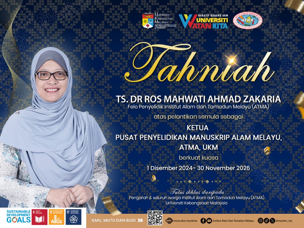 Tahniah diucapkan kepada Ts. Dr. Ros Mahwati Ahmad Zakaria, Felo Penyelidik Institut Alam dan Tamadun Melayu (ATMA) atas pelantikan semula sebagai Ketua Pusat Penyelidikan Manuskrip Alam Melayu (PPMAM), ATMA, UKM berkuat kuasa 1 Disember 2024-30 November 2026.