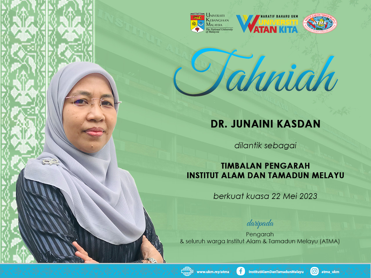 Setinggi-tinggi tahniah diucapkan kepada YBrs. Dr. Junaini Kasdan atas pelantikan sebagai Timbalan Pengarah ATMA berkuat kuasa 22 Mei 2023.