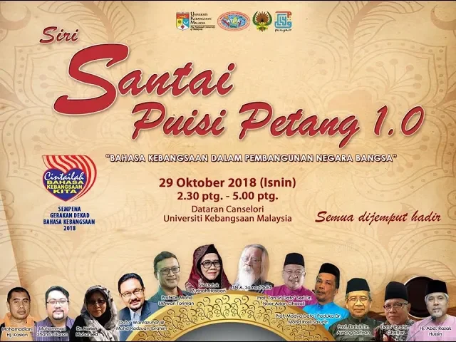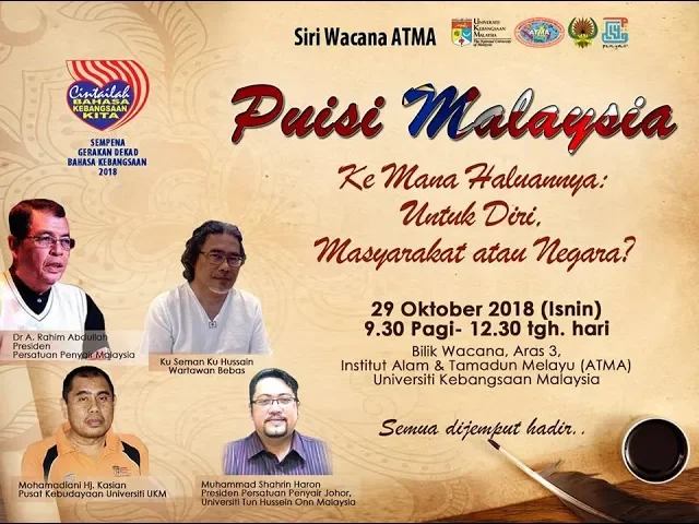 Video Siri Wacana Cendekiawan ATMA: Salah Faham Terhadap Ikon dalam Sejarah Tanah Melayu: Pejuang atau Petualang? Siri Wacana ATMA: Memulihara Kehebatan Kelelakian: Perspektif Etno-Sains Perubatan Melayu Siri Wacana Cendekiawan ATMA: Mitos Melayu Malas- Penilaian Semula Pemikiran Syed Hussein Alatas & Realiti Hari Ini Sanggar Buku ATMA: Pemikiran Awang Sariyan dalam Pemartabatan Bahasa Melayu Siri Wacana ATMA: Memartabat Warisan Arkeologi Maritim di Malaysia Majlis Belasungkawa Pak Ngah @ Datuk Suhaimi Mohd Zain Siri Wacana Cendekiawan ATMA: Kependudukan & Pergerakan Etnik di Kepulauan Melayu dari Perspektif Arkeologi, Budaya & Sejarah Sanggar Buku ATMA: Warisan Bergambar Selat Johor Barat Siri Santai Puisi Petang 1.0: Bahasa Kebangsaan dalam Pembangunan Negara Bangsa Siri Wacana ATMA: Puisi Malaysia Ke Mana Arahnya: Untuk Diri, Masyarakat atau Negara? Catatan Lama Catatan Baru