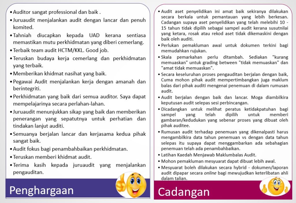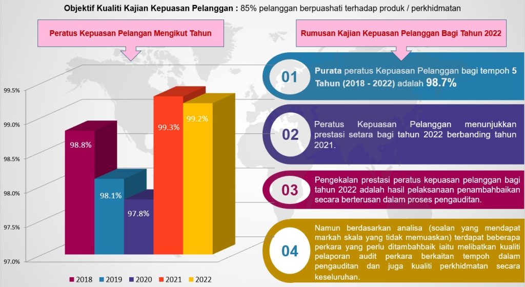 Bagi tempoh 5 tahun ini (2018 – 2022), secara puratanya sebanyak 98.7% responden/auditi berpuashati dengan perkhidmatan yang diberikan oleh UAD.