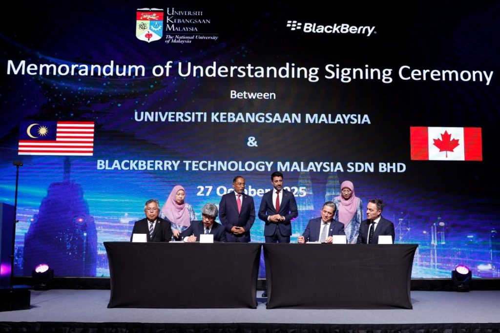 KUALA LUMPUR, 27 Oktober 2025 – Universiti Kebangsaan Malaysia (UKM) menandatangani Memorandum Persefahaman (MoU) dengan BlackBerry Technology Malaysia Sdn. Bhd. bagi memperkukuh pembangunan bakat dan penyelidikan dalam bidang keselamatan siber dan sistem terbenam (embedded system).