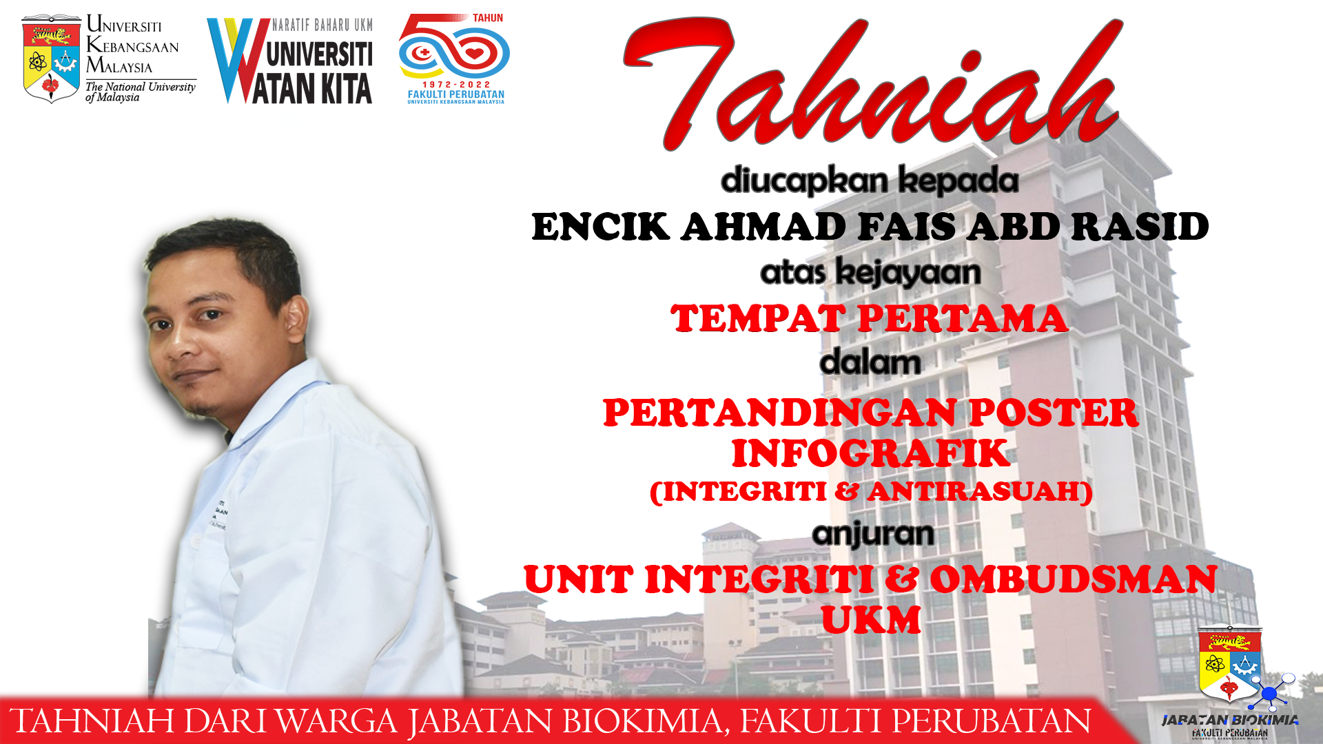 TEMPAT PERTAMA PERTANDINGAN POSTER INFOGRAFIK (INTEGRITI & ANTIRASUAH) ANJURAN UNIT INTEGRITI & OMBUDSMAN UKM