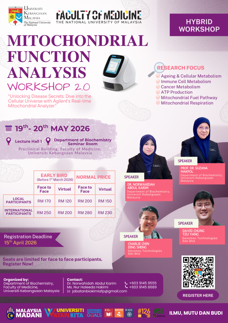 Tarikh: 19ᵗʰ – 20ᵗʰ Mei 2026 Tempat (Bersemuka): Dewan Kuliah 1 & Bilik Seminar Jabatan Biokimia, Bangunan Praklinikal, Fakulti Perubatan, UKM Mod: Hibrid (Bersemuka & Dalam Talian)