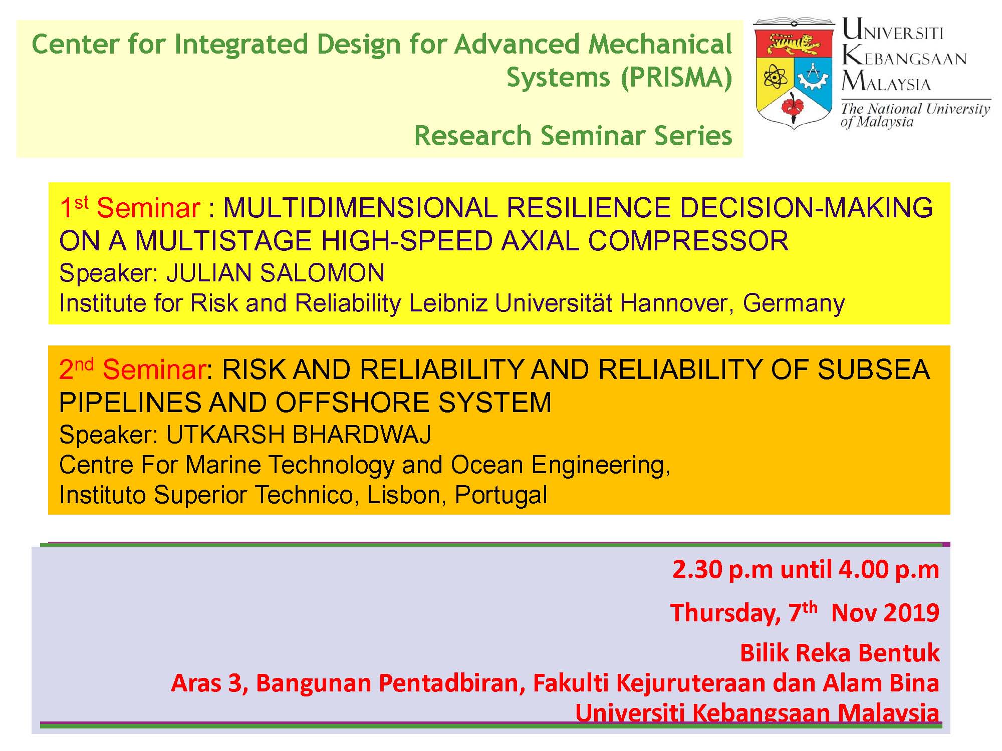 Bilik Reka Bentuk, Level 3, Administraion Building, Faculty of Engineering and Built Environment, Universiti Kebangsaan Malaysia Speaker: Julian Salomon (Institute for Risk and Reliability Leibniz Universitat Hannover, Germany) - Seminar 2: Risk and Reliability and Reliability of Subsea Pipelines and Offshore System