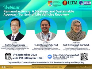 Speaker 1: Prof. Dr. Yasushi Umeda (Professor of Value Creation Division, Research into Artifacts, Center for Engineering, The University of Tokyo, Japan) Speaker 2: Ts. Siti Maisarah Mohd Pisal (Senior Manager, Strategy & Policy Development Division, Malaysia Automotive, Robotics and IoT Institute) Moderator: Prof. Dr. Dzuraidah Abd Wahab (Head Centre for Automotive Research, Faculty of Engineering and Built Environment, Universiti Kebangsaan Malaysia)