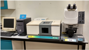 FTIR represents Fourier transform infrared spectroscopy. The spectrum indicating the signature molecular of a sample can be retrieved when infrared ray is radiated through a sample. This is due part of the ray will be absorbed by the sample and some is transmitted through the sample. The usefulness of infrared spectroscopy arises because different chemical structures (molecules) produce different spectral fingerprints.