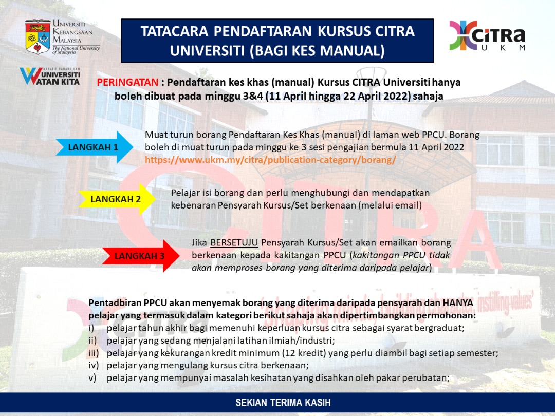 Berikut adalah tatacara pendafataran kursus citra universiti bagi kes khas. Sila patuhi semua prosedur agar pendaftaran berjalan dengan lancar.
