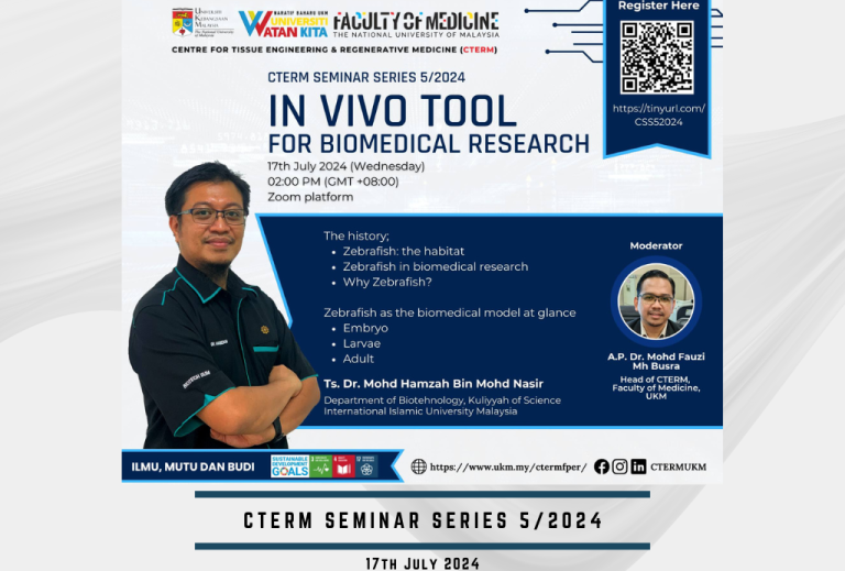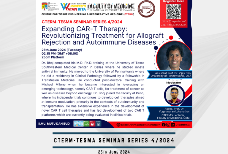 Menu Home About Us Profile Background Our Leadership TERAS UKM People Our Team Organizational Chart Advisory Board Alumni Facilities Research & Development cGMP Collaborator Disclaimers Contact Us Research Research Area Publications Intellectual Properties CTERM Staff Education Programme PhD (Tissue Engineering) Master in Medical Science (Tissue Engineering) Postgraduate Opportunities For Undergraduates Services Cells Provision Facility for …