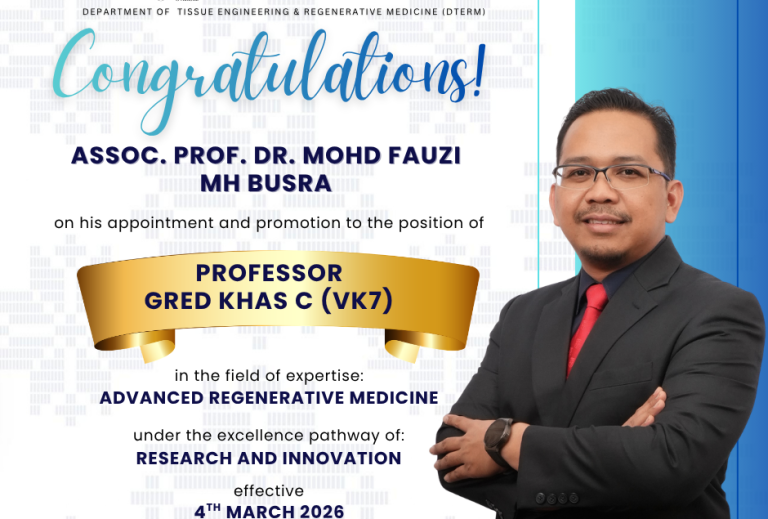 Congratulations on the promotion to Professor (Gred Khas C, VK7) We are pleased to extend our congratulations to Associate Professor Dr. Mohd Fauzi Mh Busra on his well-deserved promotion to the position of Professor (Gred Khas C, VK7), in the field of Advanced Regenerative Medicine under the Research and Innovation excellence track, effective 4th March …