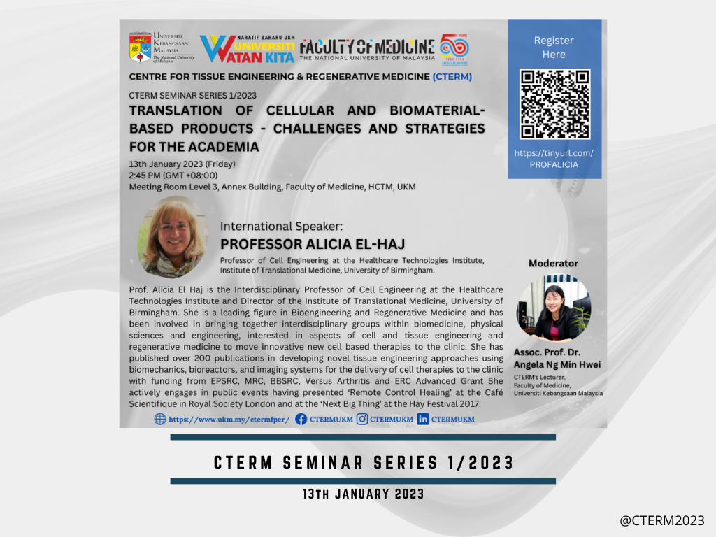 A special thanks to our invited speaker, Assoc. Prof. ChM. Dr. Siti Efliza Ashari from Universiti Putra Malaysia, for her insightful sharing. This seminar provided participants with valuable knowledge on applying statistical tools in the design of experiments especially in tissue engineering and regenerative medicine research.