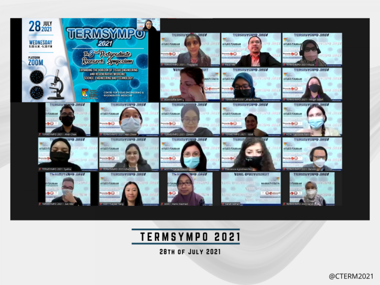 On 28th of July 2021, postgraduate students from CTERM have successfully organized the TERMSYMPO 2021: The 3rd Postgraduate Research Symposium on Tissue Engineering & Regenerative Medicine. With the theme of “Expanding the Horizon of Tissue engineering and regenerative medicine: Science, engineering and technology”, TERMSYMPO has gathered more than 70 participants from local and international universities. This symposium were able to highlight the postgraduate students research at the intersection of the fields of tissue engineering, regenerative medicine, and biomaterial.
