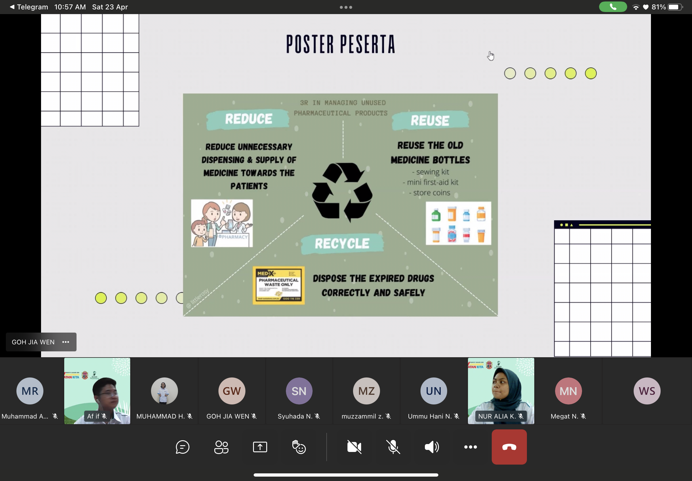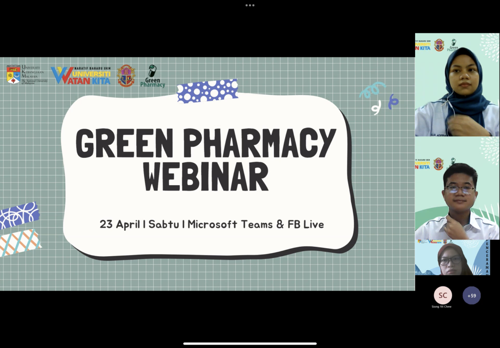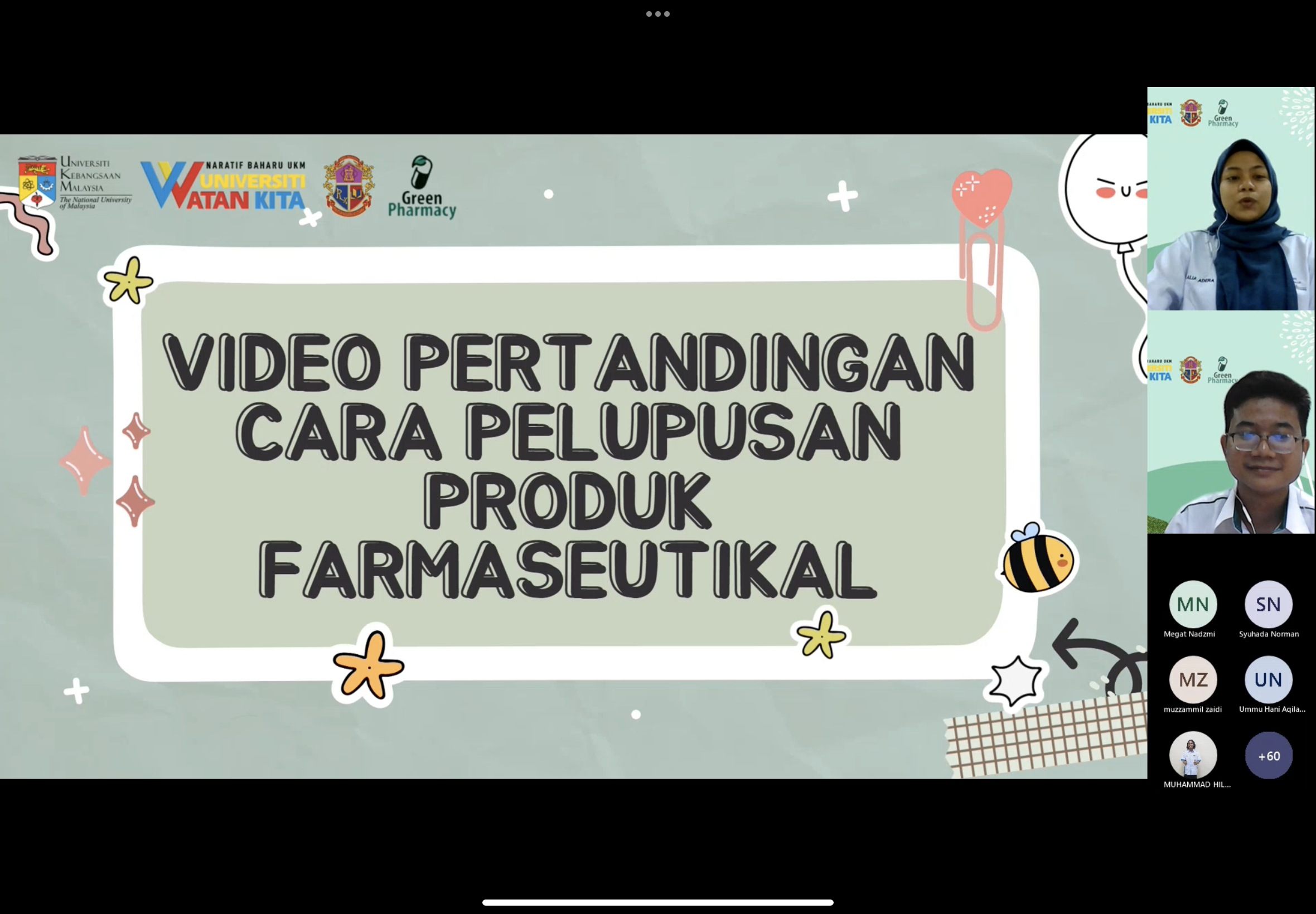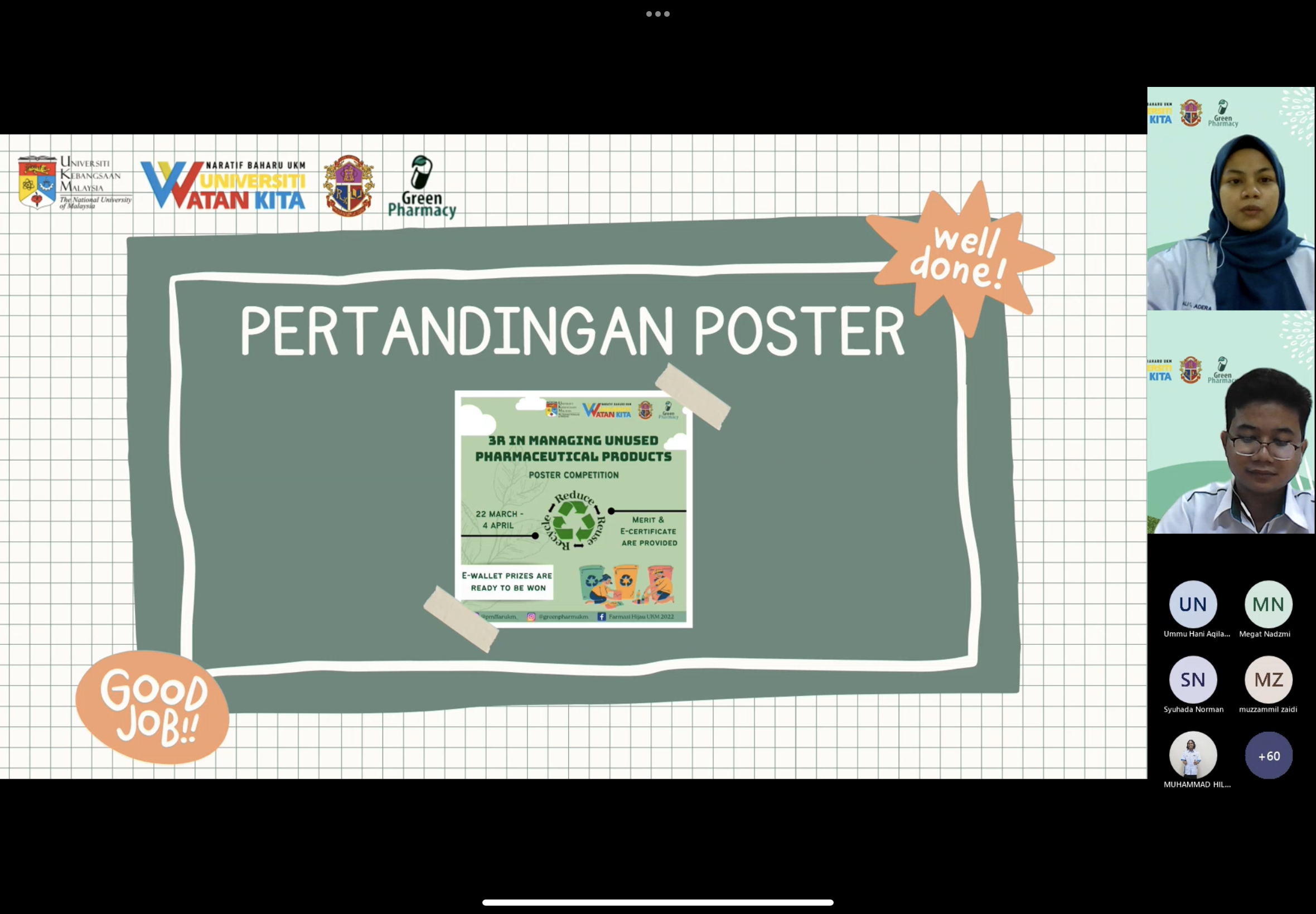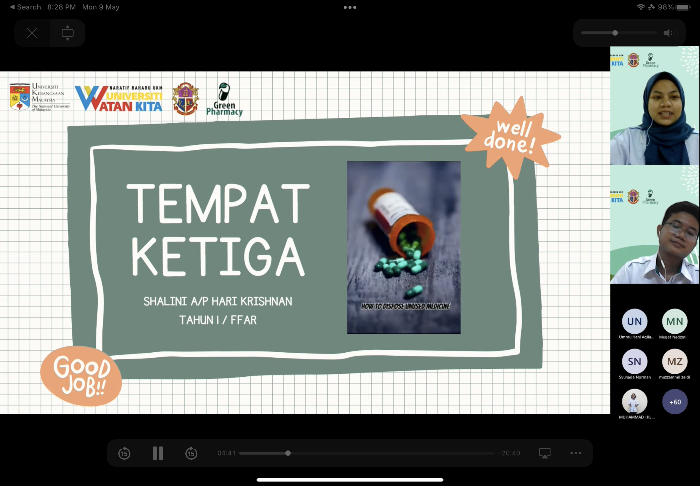 On the morning of the 23rd of April 2022, a Green Pharmacy talk and closing ceremony were held online via Microsoft Teams. The event kick-started with a speech from Muhammad Hilman Bin Ghazali, Director of Green Pharmacy 2022 where he expresses his wishes that the program has managed to raise awareness on the importance of taking care of the environment. After that, Assoc. Prof. Dr. Mohd Makmor Bakry, Dean of the Faculty of Pharmacy UKM officiated the closing ceremony and highlighted the importance of this program for students and the public. The first webinar was given by Puan Syuhada Binti Norman where she shares about the effects of improper disposal and how to dispose unused medicines safely. At the end of her talk, participants could answer a quiz where they stood a chance to win a tote bag from World Wildlife Fund (WWF). The second webinar on the ‘Management of Pharmaceutical Waste in Pharmaceutical Industry’ was given by Encik Megat Nazmi Aizuddin Bin Megat Khas where he explains in detail about the concept and methods of pharmaceutical disposal as well as the consequences to the environment and human health if improper pharmaceutical waste disposal practices were continued. Both webinars ended with a fruitful Q&A session. The webinars serve as an eye-opener as well as boost the knowledge and awareness of participants about how much impact our actions can have on the environment.