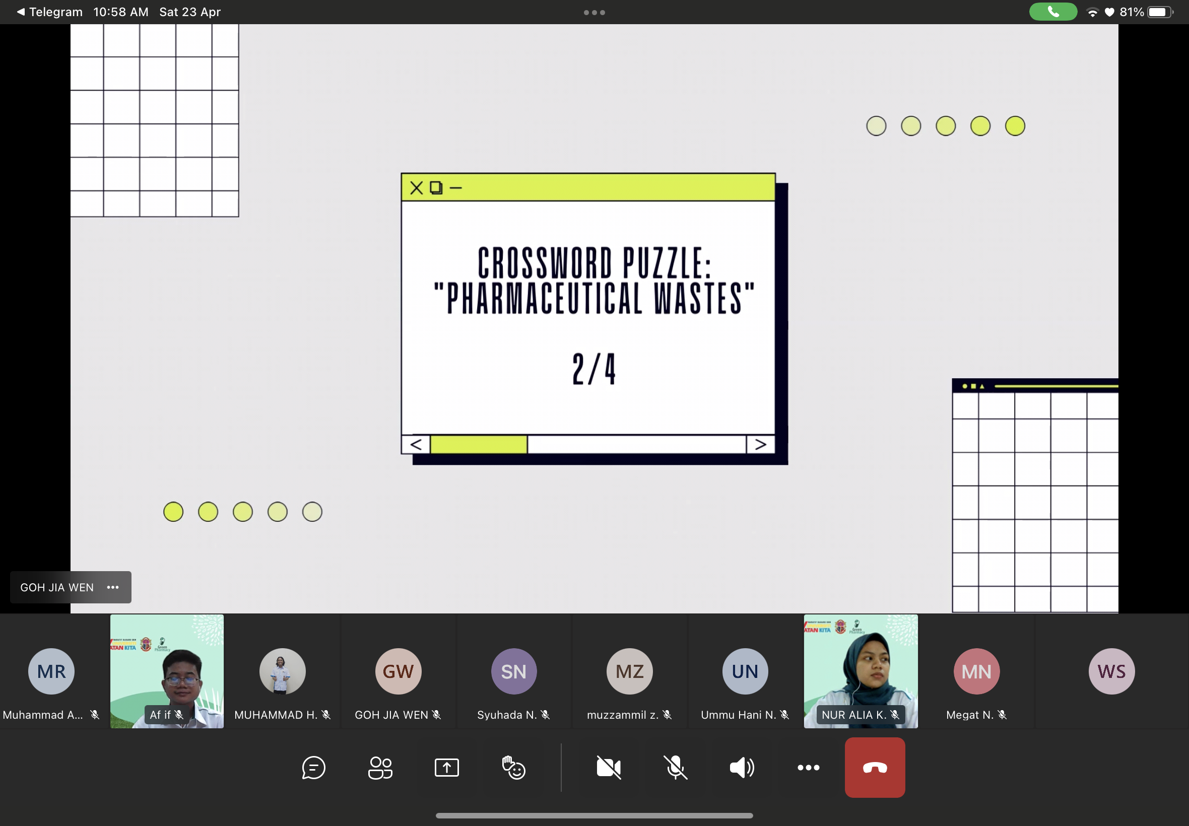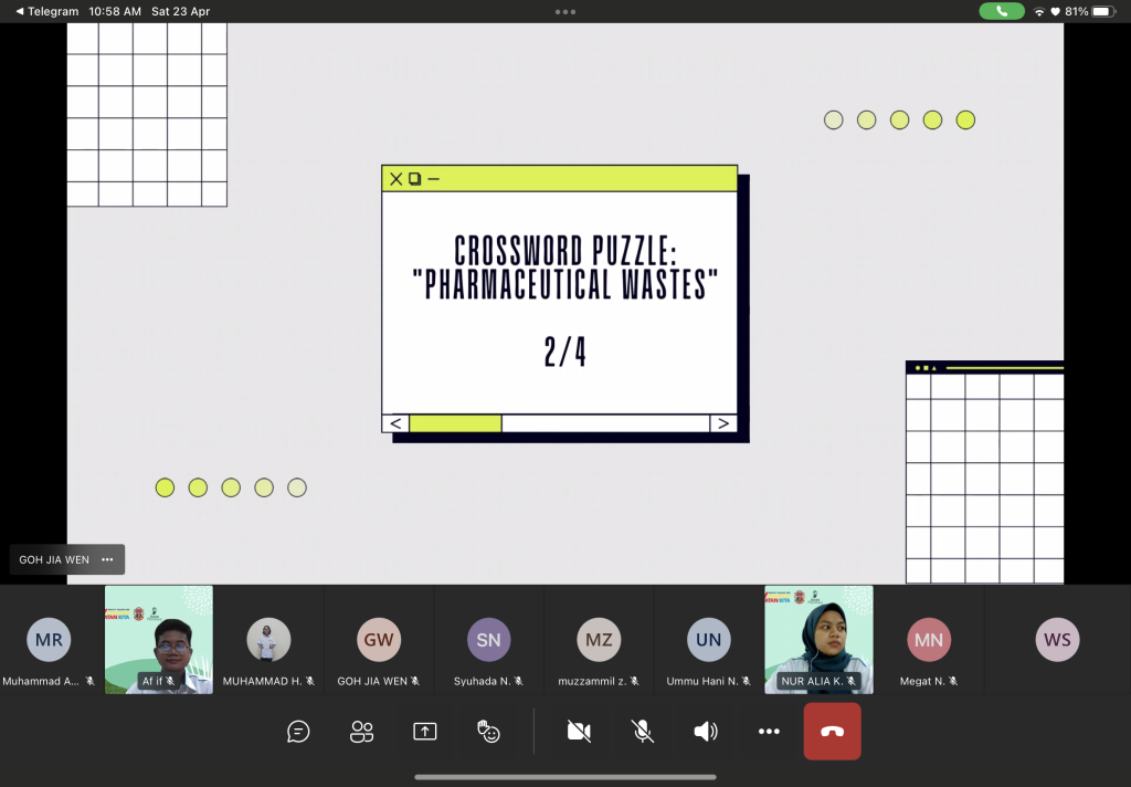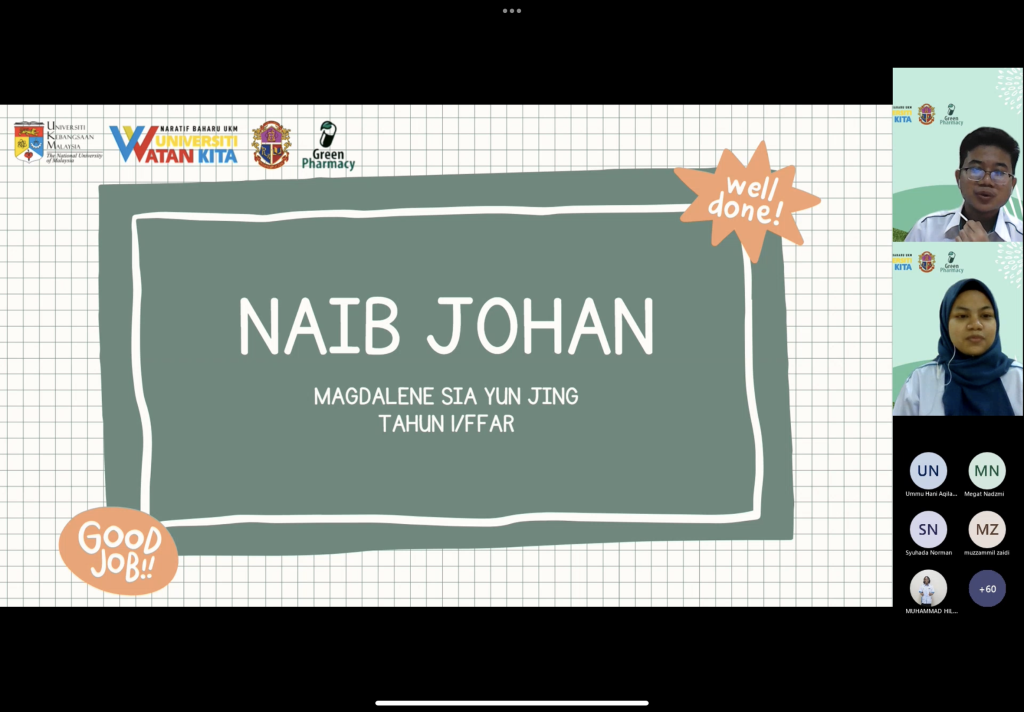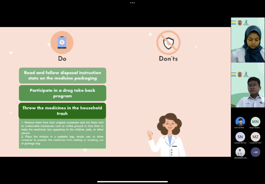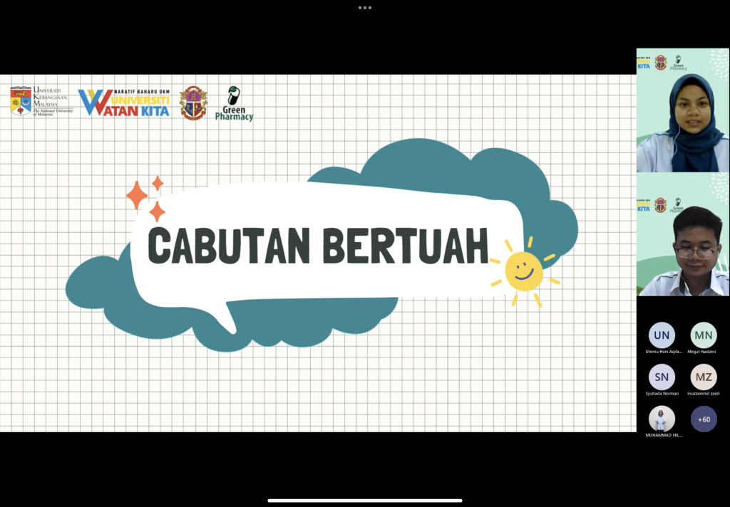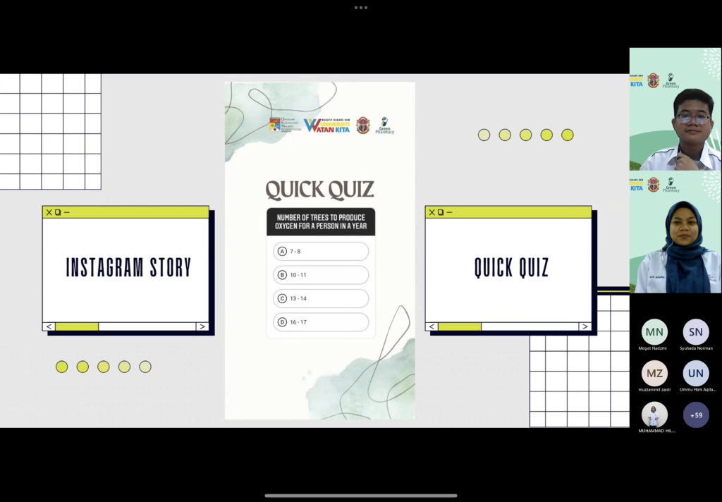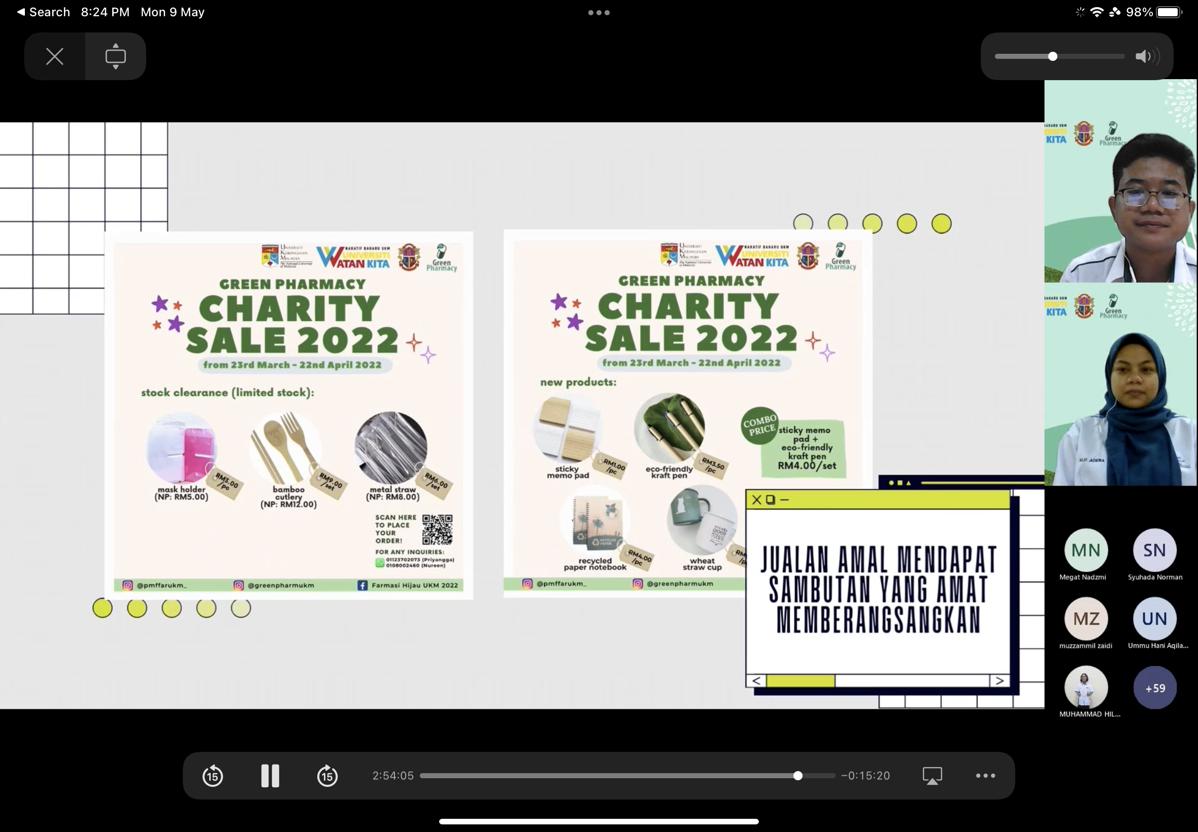 On the morning of the 23rd of April 2022, a Green Pharmacy talk and closing ceremony were held online via Microsoft Teams. The event kick-started with a speech from Muhammad Hilman Bin Ghazali, Director of Green Pharmacy 2022 where he expresses his wishes that the program has managed to raise awareness on the importance of taking care of the environment. After that, Assoc. Prof. Dr. Mohd Makmor Bakry, Dean of the Faculty of Pharmacy UKM officiated the closing ceremony and highlighted the importance of this program for students and the public. The first webinar was given by Puan Syuhada Binti Norman where she shares about the effects of improper disposal and how to dispose unused medicines safely. At the end of her talk, participants could answer a quiz where they stood a chance to win a tote bag from World Wildlife Fund (WWF). The second webinar on the ‘Management of Pharmaceutical Waste in Pharmaceutical Industry’ was given by Encik Megat Nazmi Aizuddin Bin Megat Khas where he explains in detail about the concept and methods of pharmaceutical disposal as well as the consequences to the environment and human health if improper pharmaceutical waste disposal practices were continued. Both webinars ended with a fruitful Q&A session. The webinars serve as an eye-opener as well as boost the knowledge and awareness of participants about how much impact our actions can have on the environment.