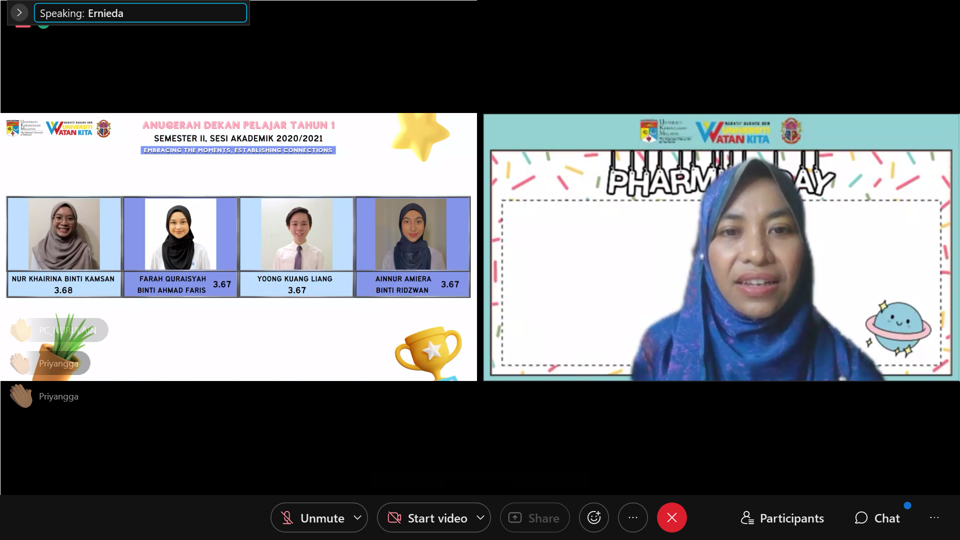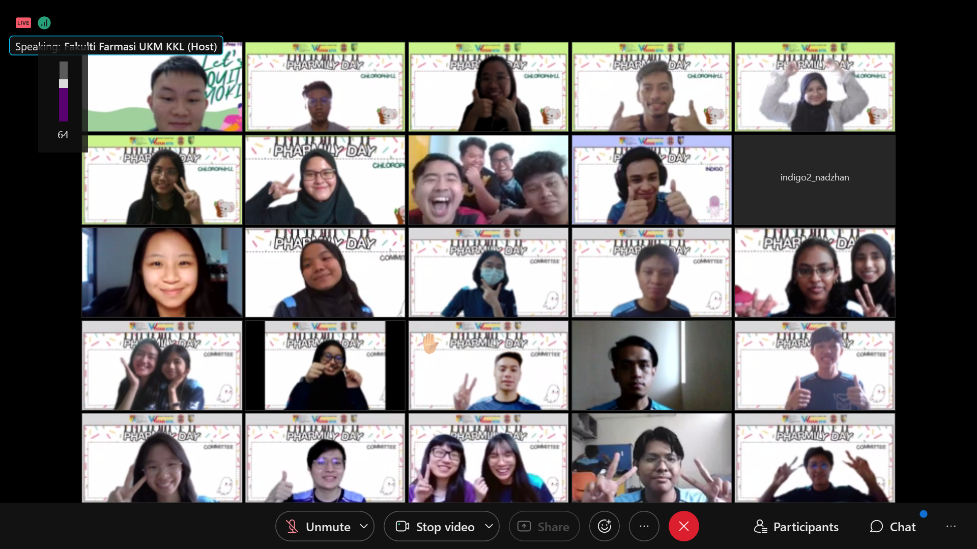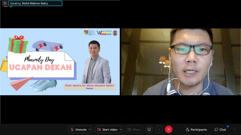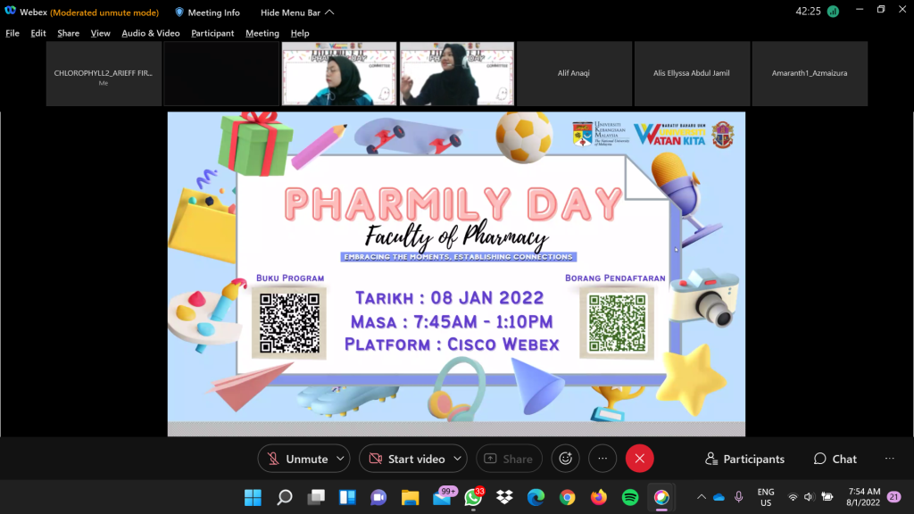 Pharmily Day is an annual event organised by the Faculty of Pharmacy, Universiti Kebangsaan Malaysia (UKM). The event was held on Saturday, 8 January 2022 via the application ‘Cisco Webex Meeting’. The aim of Pharmily Day is to strengthen the relationships among students and faculty’s staff through e-sports and interactive activities. Besides, this event also gave a chance to Year 1 pharmacy students to show their talents through video performances.