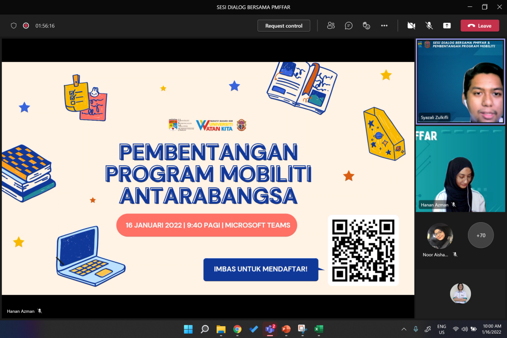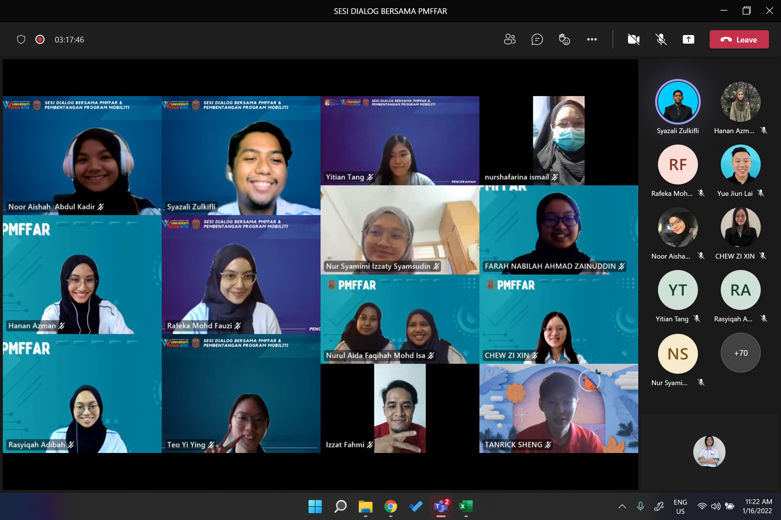 As university students, a vital sense of belonging and being part of the university community is essential in leading a memorable student life. On the 16th of January 2022, an interactive session with PMFFar was organised by the student association of the Faculty of Pharmacy UKM to address students’ inquiries related to academic and cocurricular events. This session was conducted online via Microsoft Teams and there were nearly 100 participants including lecturers and pharmacy students from Year 1 to Year 4.