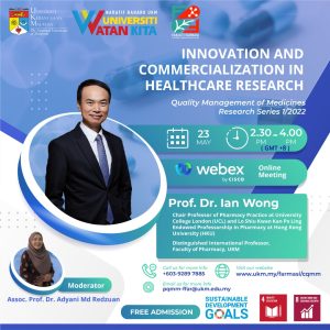 On the 23rd May 2022, the Centre for Quality Management of Medicines, Faculty of Pharmacy UKM conducted the first research seminar entitled Innovation and Commercialization