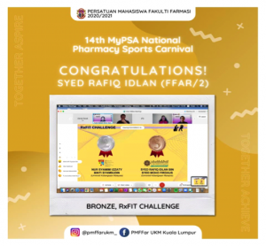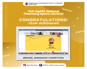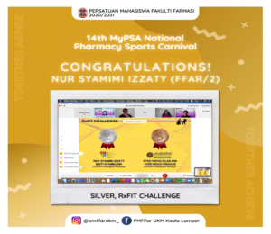 The 14th National Pharmacy Sports Carnival 2021 was held from 28the March to 11th April 2021. The event was organized by Universiti Teknologi Mara (UiTM) and Malaysian Pharmacy Students’ Association (MyPSA). The sports carnival included a few e-sports events such as Rx Fit Challenge, Freestyle Skipping Competition and Aerodance Competition, Virtual Run.