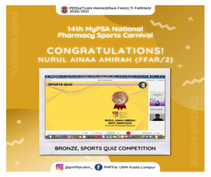 The 1st MyPSA National Pharmacy Quiz Challenge 2021 a competition under the 1st MyPSA National Pharmacy Competition 2021 was organised by the University Kebangsaan Malaysia (UKM), UniKL RCMP, International Medicine University (IMU) and Malaysian Pharmacy Students’ Association (MyPSA). This program was held from 24th April to 9th of May 2021 involving pharmacy students in Malaysia.