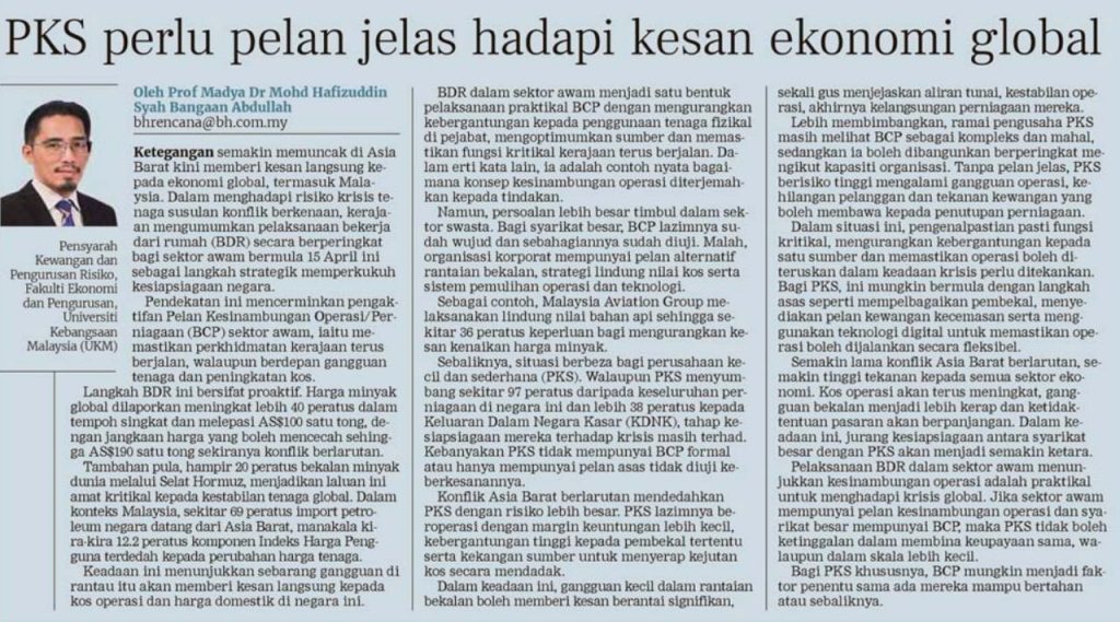 PKS Perlu Pelan Jelas Hadapi Kesan Ekonomi Global (Berita Harian) PM Dr Mohd Hafizuddin Syah Bangaan Abdullah – FEP