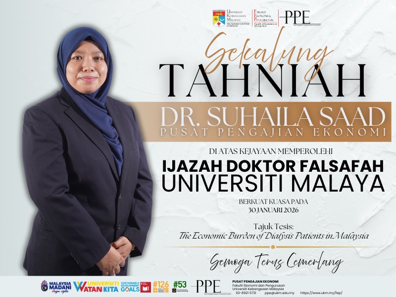 Tahniah dan syabas kepada Dr. Suhaila Saad, Pusat Pengajian Ekonomi, atas pencapaian cemerlang memperoleh Ijazah Doktor Falsafah (PhD) Universiti Malaya.