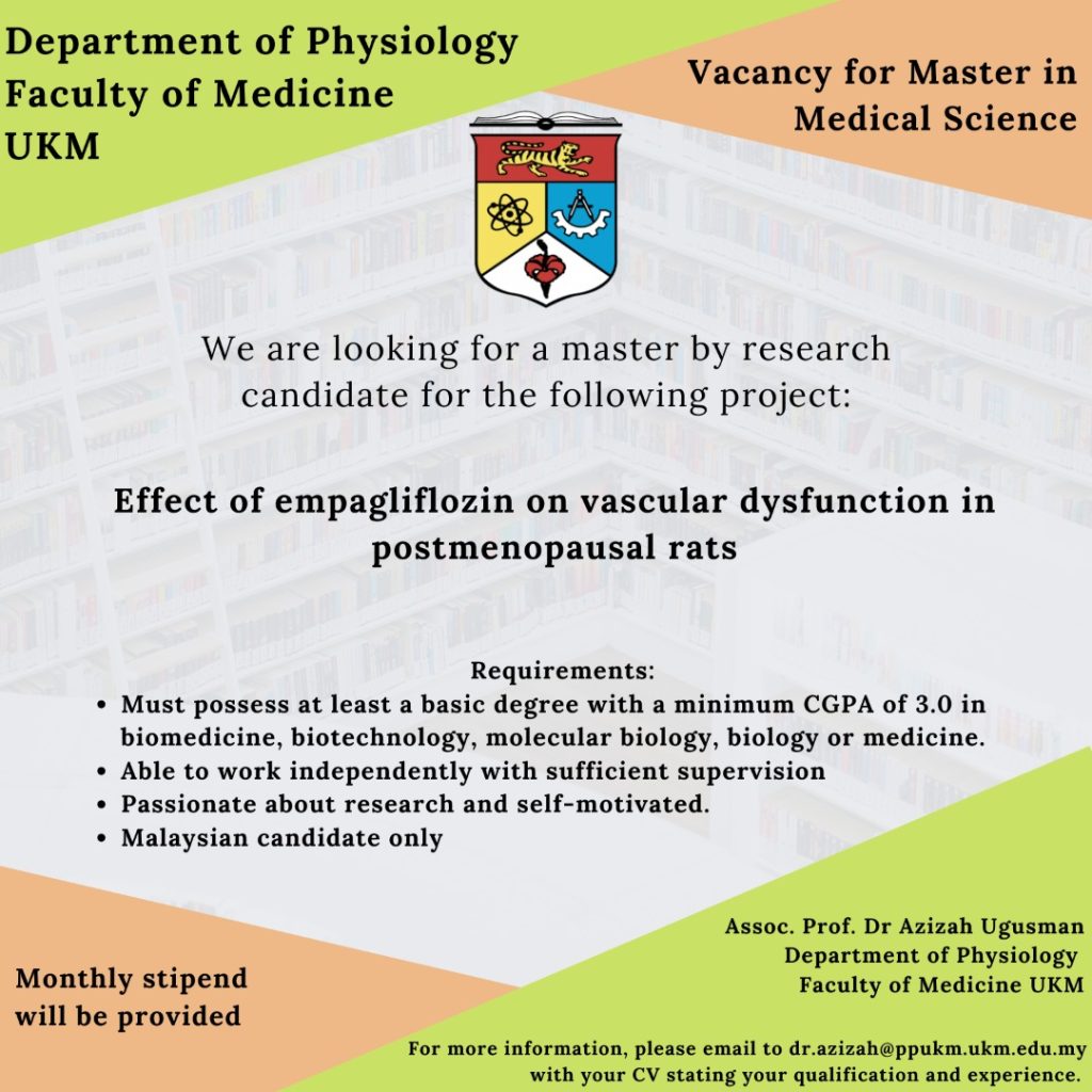 Maklumat lanjut mengenai tawaran ini, sila hubungi Prof. Madya Dr. Azizah Ugusman (dr.azizah@ppukm.ukm.edu.my).