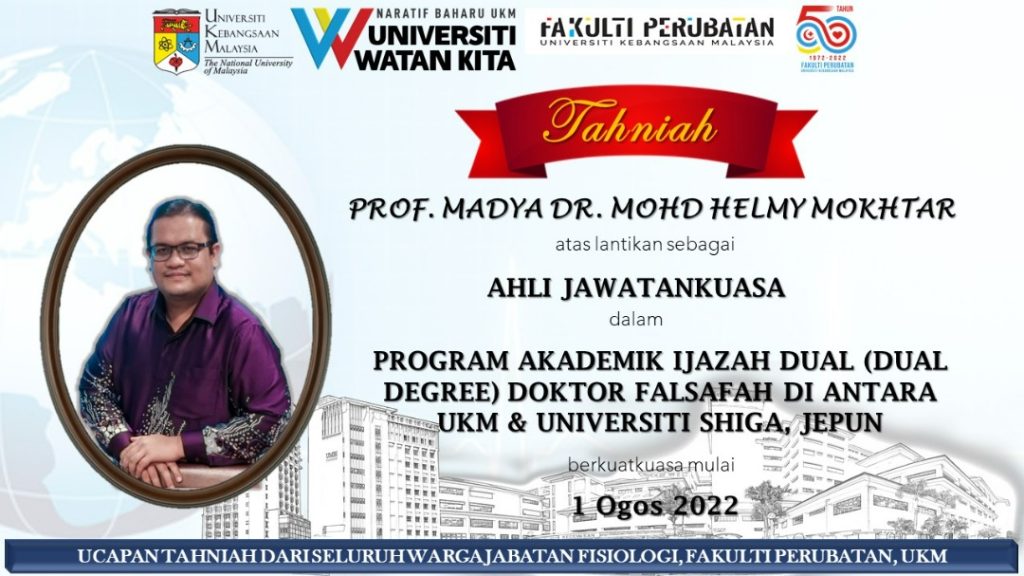 Jabatan Fisiologi merakamkan ucapan setinggi tinggi tahniah kepada Prof. Madya Dr. Mohd Helmy Mokhtar atas lantikan sebagai Ahli Jawatankuasa Program Akademik Ijazah Dual (Dual Degree) Doktor Falsafah antara UKM dan Universiti Shiga, Jepunberkuatkuasa mulai 1 Ogos 2022.