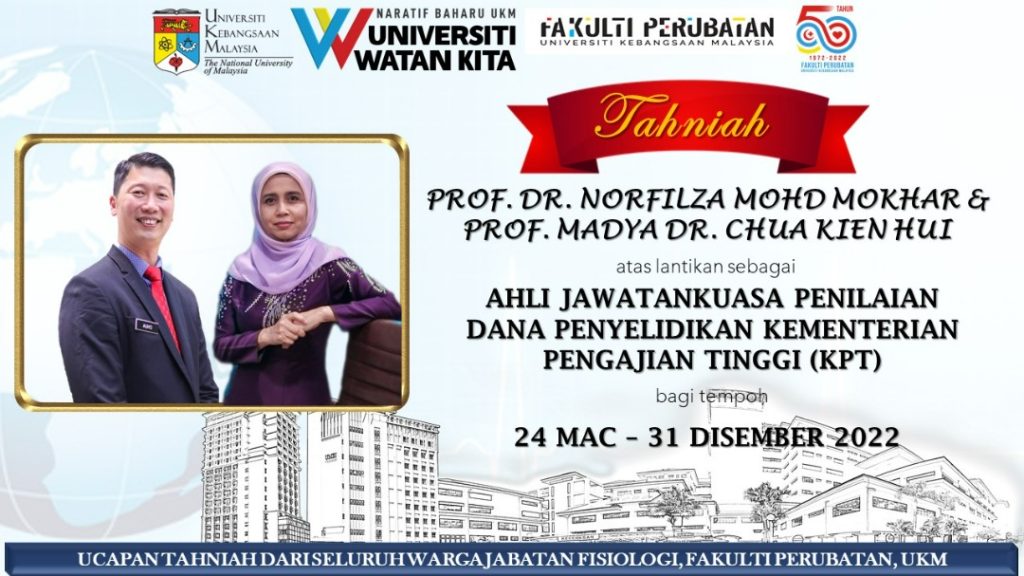 Jabatan Fisiologi merakamkan ucapan setinggi-tinggi tahniah kepada Prof. Dr. Norfilza Mohd Mokhtar & Prof. Madya Dr. Chua Kien Hui atas lantikan sebagai Ahli Jawatankuasa Penilaian Dana Penyelidikan Kementerian Pengajian Tinggi (KPT) bagi tempoh 24 Mac 2022 sehingga 31 Disember 2022.