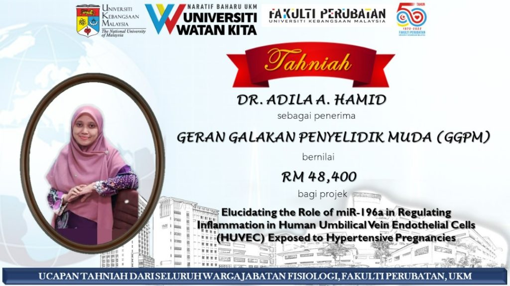 Department of Physiology would like to offer our heartfelt congratulations to Dr. Adila A. Hamid on securing Geran Galakan Penyelidik Muda (GGPM) with amount RM 48,400 from Universiti Kebangsaan Malaysia.