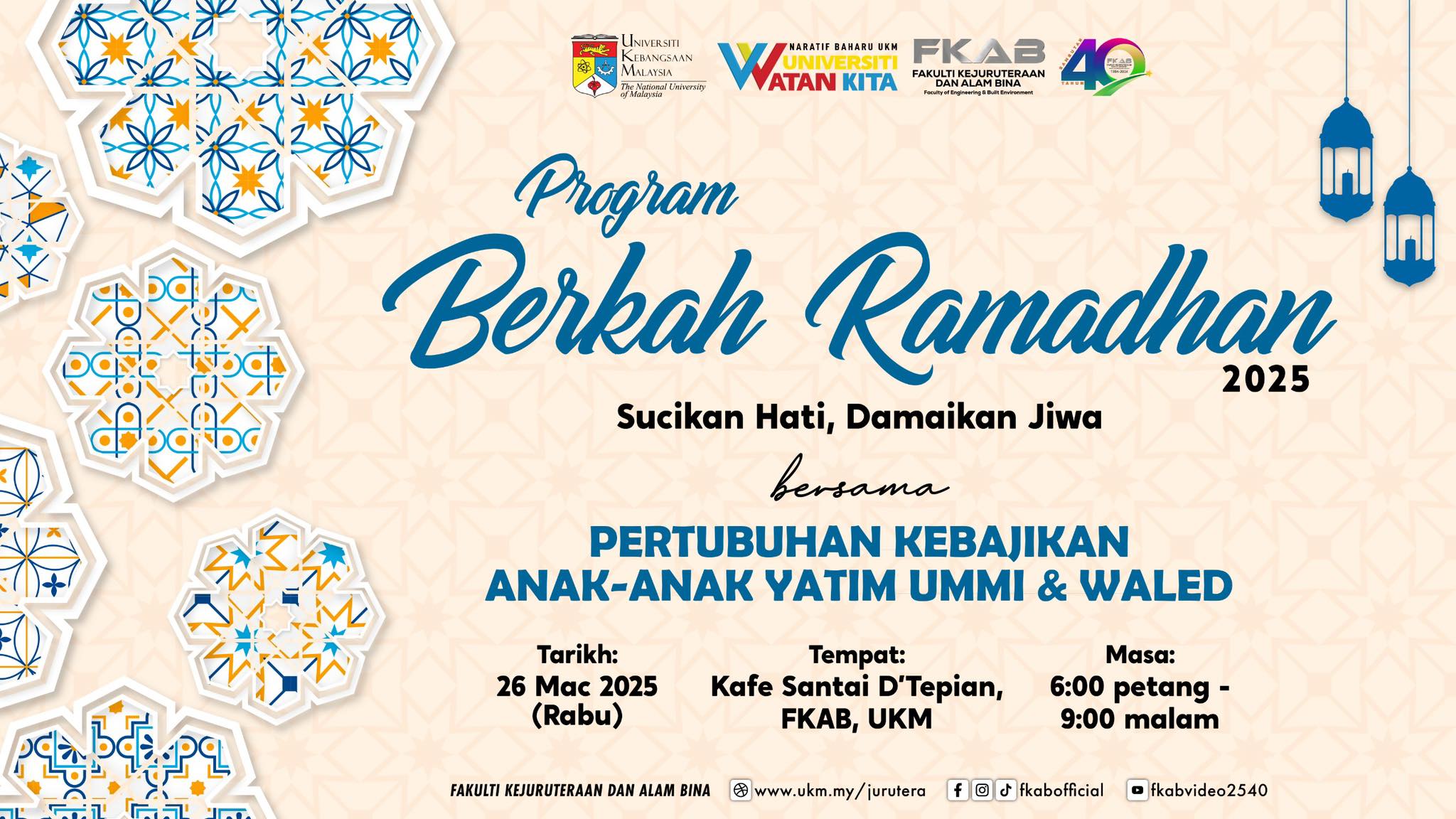 Berkah Ramadhan Bersama Rumah Anak Yatim Bangi Nur Ain is an annual program managed and sponsored by Faculty of Engineering and Built Environment, UKM with the help of Persatuan Mahasiswa Fakulti Kejuruteraan dan Alam Bina (PEMATRA)