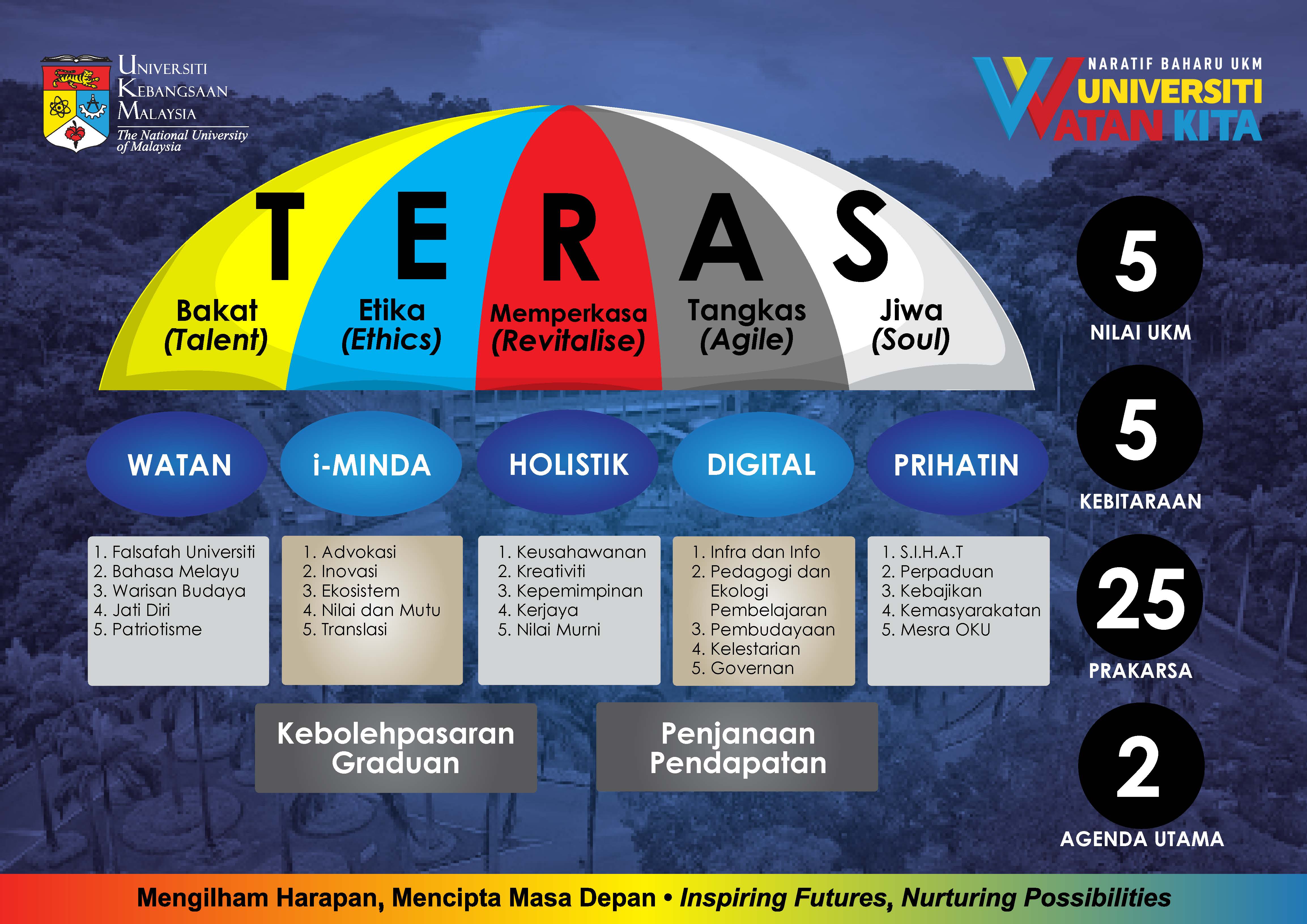 T.E.R.A.S and Kebitaraan is a new narrative that displays the role of national universities that belong to its citizens and the entire community. Indeed, this new T.E.R.A.S purple is intended to enable UKM citizens to make references and guide the direction of the university in an effort to increase achievement to the highest level. The meaning of CORE includes Talent, Ethics, Revitalize, Agile and Soul and it becomes the crimson that overshadows the 5 virtues of Watan, i-Minda, Holistic, Digital and Prihatin.
