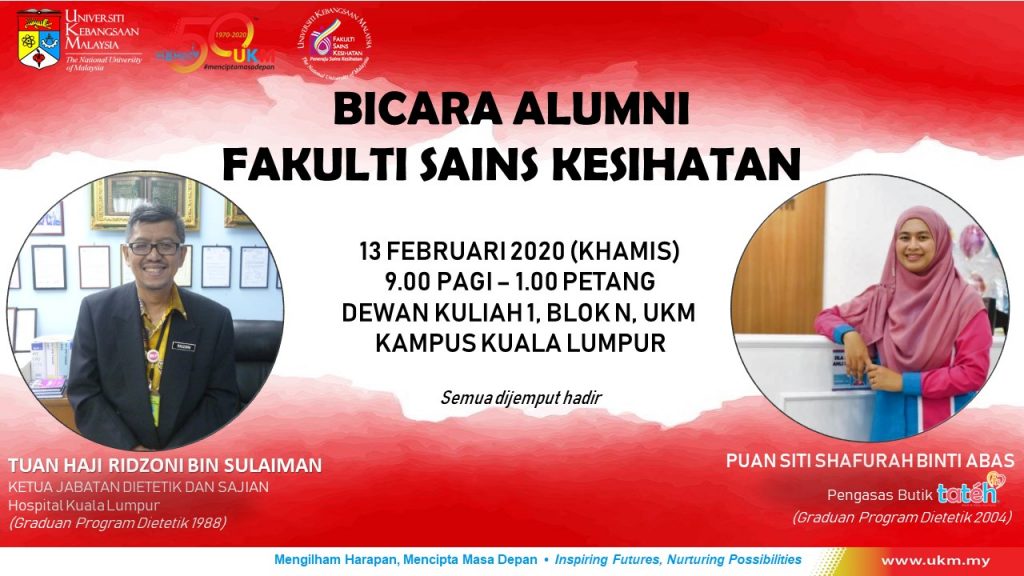 Fakulti Sains Kesihatan, di bawah Penolong Dekan Hal Ehwal Pelajar & Alumni (HEPA) sekali lagi berjaya menganjurkan Program Bicara Alumni untuk kali ketiga. Cik Farahana Mohamed, penerima Anugerah Pelajaran Diraja (Pingat Jaya Cemerlang) bagi sesi akademik 2018/2019) dan Puan Zatur Hassim (Specialized Nutrition Director Friesland Campina WAMCO Nigeria PLC.) merupakan alumni yang dijemput pada program kali ini. Kedua-dua alumni hebat ini merupakan alumni daripada Program Sains Bioperubatan.