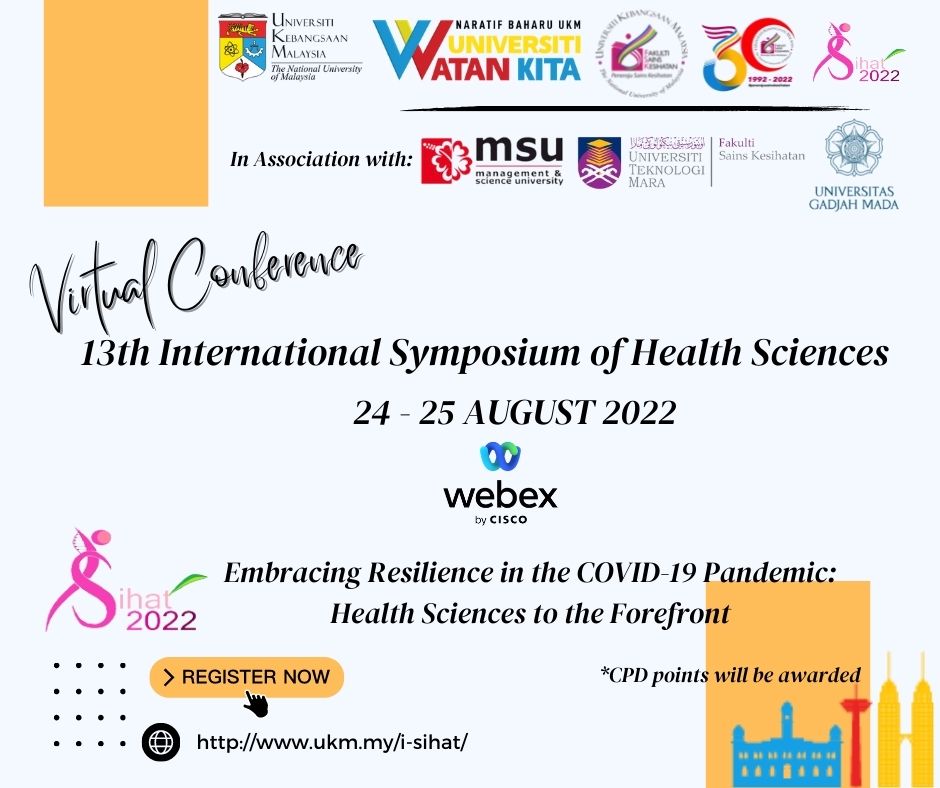 It is our pleasure to invite you to the 13th International Symposium of Health Sciences 2022 (i-SIHAT 2022) via online platform (Webex). This event is organised by the Faculty of Health Sciences, Universiti Kebangsaan Malaysia in Association with the Faculty of Health Sciences, UiTM, Management and Science University (MSU) and Universitas Gajah Mada. With the theme “Embracing Resilience in the COVID-19 Pandemic: Health Sciences to the Forefront”, we are looking forward to the outstanding scientific program featuring cutting-edge sessions on biomedical science, optometry, occupational therapy, physiotherapy, dietetics, nutrition, diagnostic imaging and radiotherapy, audiology, speech, environmental health and forensic science.
