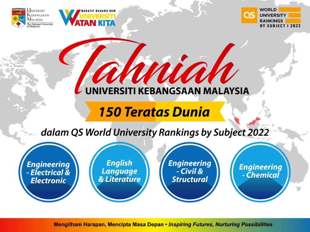 Sebanyak 25 subjek di UKM telah diiktiraf dan berjaya mendapat tempat dalam kelompok subjek terbaik di dunia. Tiga daripadanya berada di kedudukan 150 terbaik dunia dalam penarafan QS World University Ranking (WUR) by Subject 2022. Subjek-subjek tersebut adalah English Language & Literature, Chemical Engineering dan Civil Engineering, manakala tiga subjek lagi iaitu Mechanical Engineering, Materials Science dan Law telah meningkat satu sela berbanding tahun lepas. Tujuh subjek pula kekal di kedudukan seperti tahun sebelumnya. Ini menjadikan kedudukan UKM dalam kesemua lima bidang iaitu Arts & Humanities, Engineering & Technology, Life Sciences & Medicine, Natural Sciences dan Social Sciences & Management meningkat dengan cemerlang. Tahniah UKM! UKM Mara!
