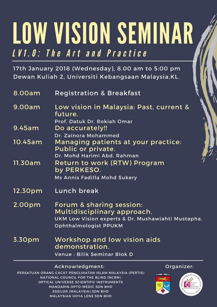 Jabatan Optometri, FSK telah menjalankan Seminar bertajuk Low vision: The Art and Practice Seminar pada 17 Januari 2018 di Dewan Kuliah 2, Kampus Kuala Lumpur. Seminar ini telah dihadiri oleh pelbagai Pakar Optometri dari pihak kerajaan dan swasta.