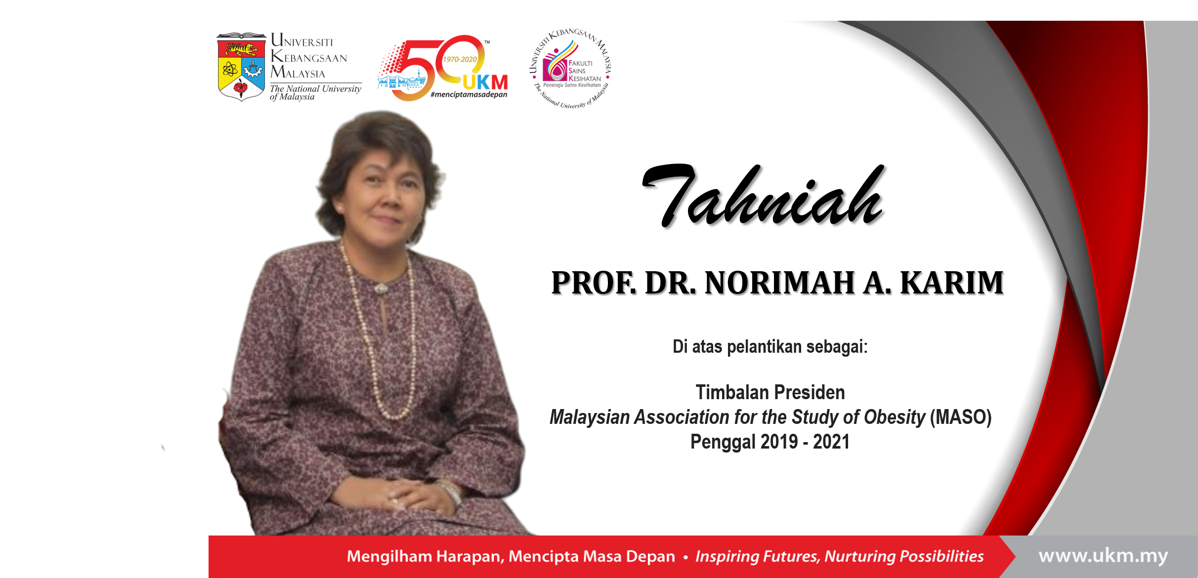 Ucapan Tahniah Fakulti merakamkan ucapan tahniah kepada Prof. Dr. Norimah A. Karim atas lantikan sebagai Vice President of Malaysian Association for the Study of Obesity…