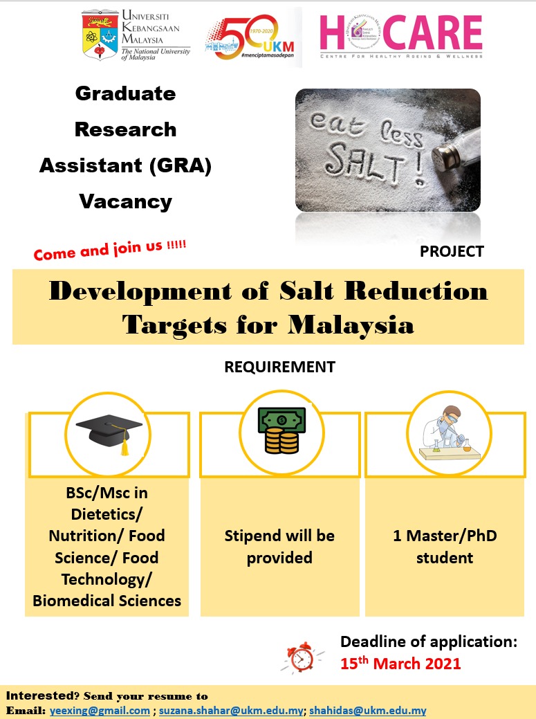 GRA Vacancy @ FSK Come and join us now. We were looking for a dedicated Graduate Research Assistant (GRA) who is interested in Salt Reduction…
