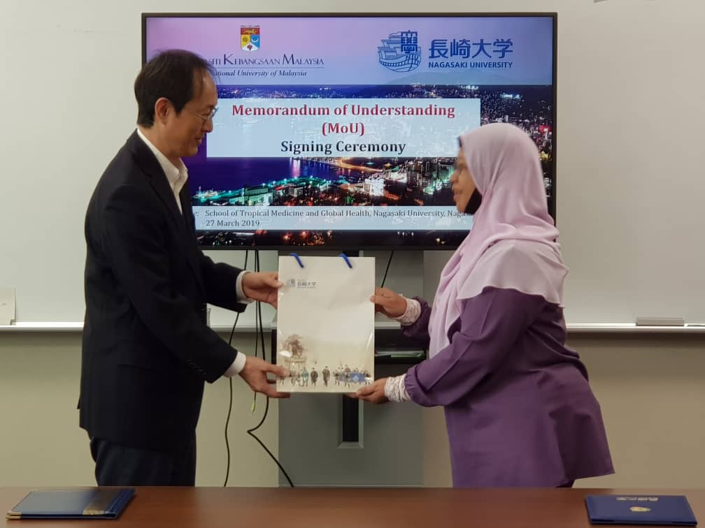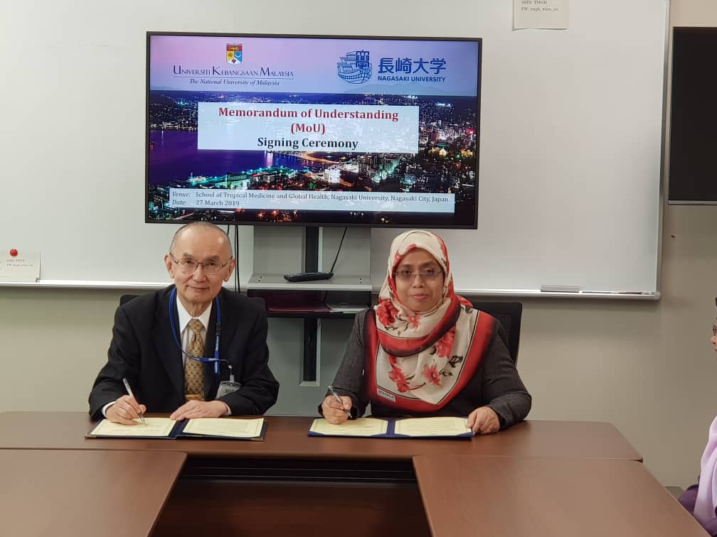 27 March 2019, Nagasaki Jepun- Ceremony signing Memorandum of Understanding (MoU) between Universiti Kebangsaan Malaysia and Nagasaki University, Japan was held at the School of Tropical Medicine and Global Health, Nagasaki University, Japan. This agreement will involve research activities in the field of public health and general health.  Prof. Dr. Bariah Mohd Ali (Dean of Faculty of Health Sciences) represented UKM while Nagasaki University by Prof. Dr. Moji Kazuhiko (Vice Dean, School of Tropical Medicine and Global Health). Hopefully, this networking will give more opportunities in research projects between these two universities.