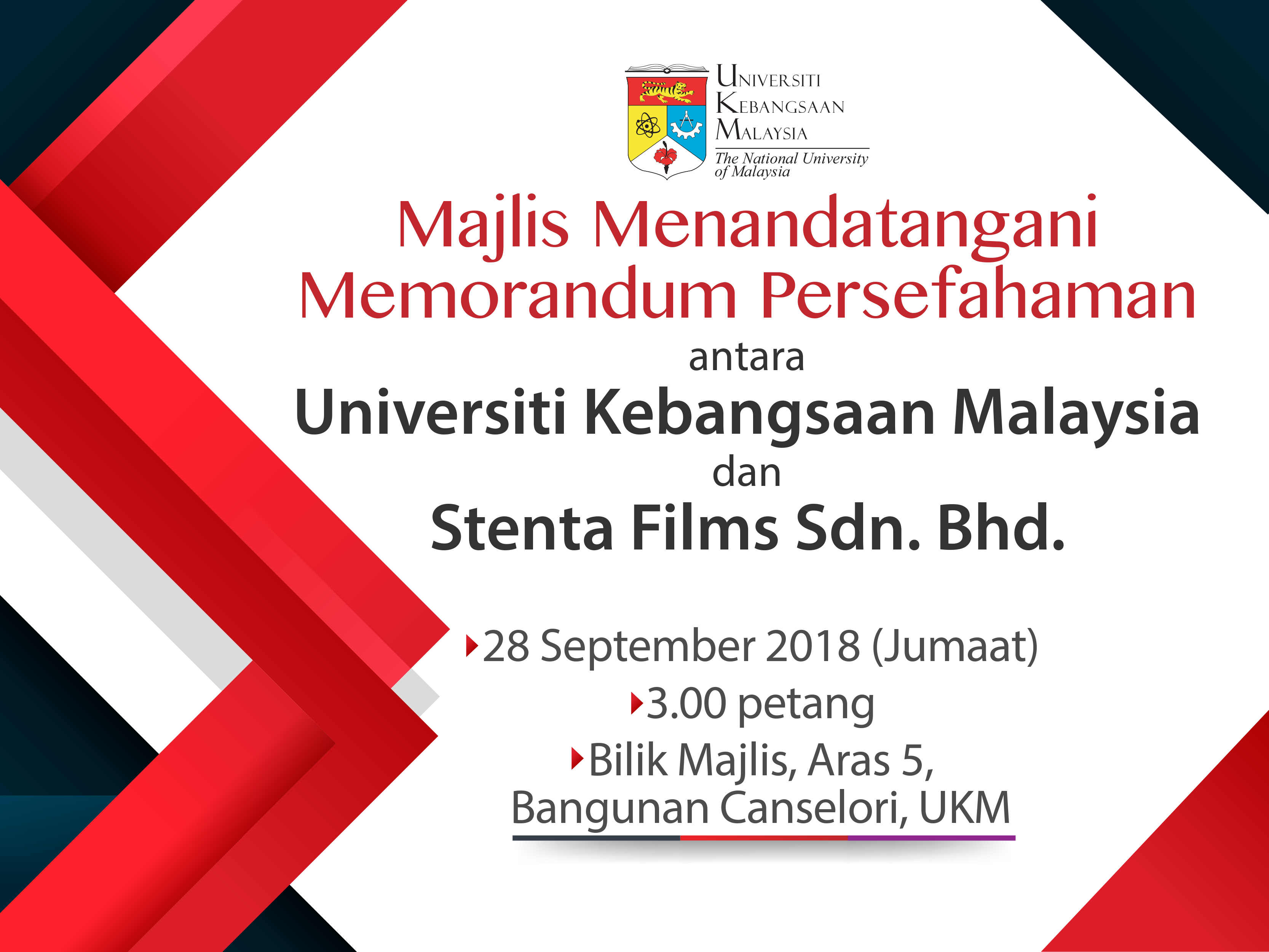 Tarikh: 28 September 2018 (Jumaat ) | Tempat: Bilik Majlis, Canselori | Masa: 3.00 ptg.