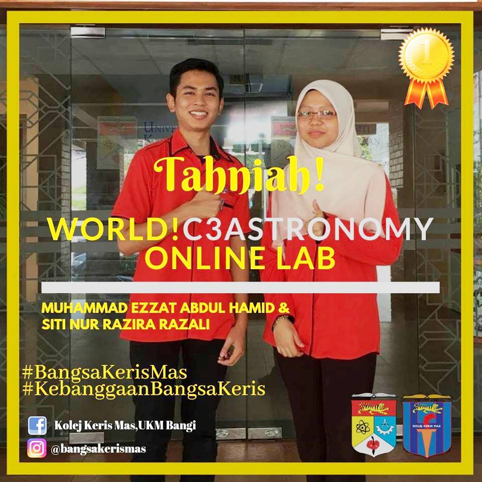 Tahniah! Muhammad Ezzat Abdul Hamid dan Siti Nur Razira Razali, pelajar Tahun 3 Program Fizik, FST dari Kolej Keris Mas UKM yang telah memenangi C3Astronomy…