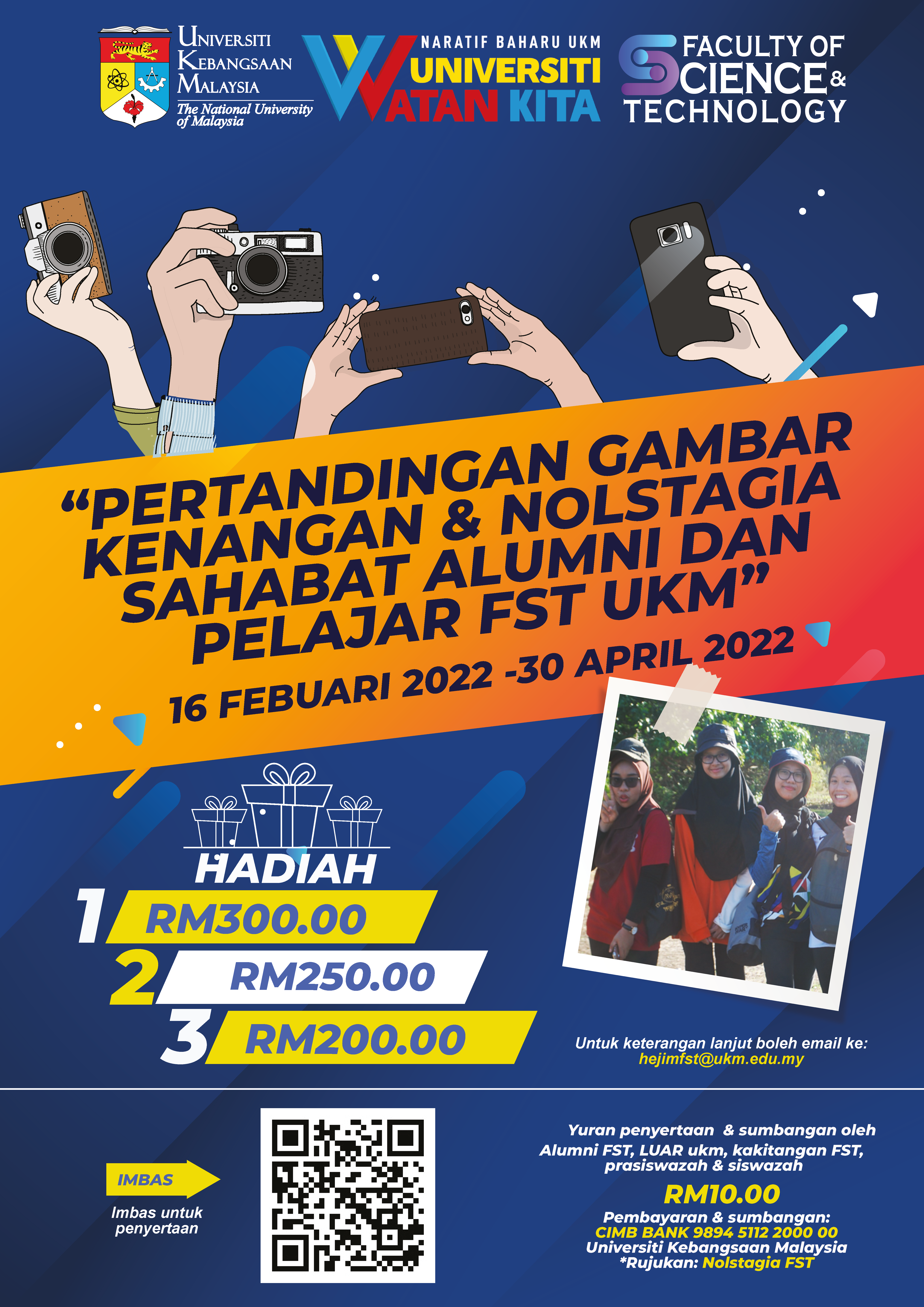 Terdapat 3 kategori iaitu 1) Alumni FST (luar) 2) Alumni FST (staff ukm) 3) Pelajar semasa ( prasiswazah dan siswazah). Pertandingan ini bertemakan “Kenangan dan Nostalgia Universiti Watan Ku” Mohon bantuan semua untuk memaklumkan kepada Alumni program dan kepada pelajar masing-masing. Terima kasih.