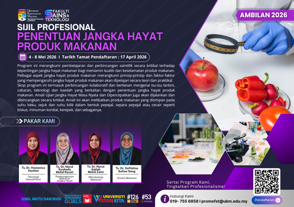 Program ini merangkumi pembelajaran dan perbincangan saintifik secara kritikal terhadap kepentingan jangka hayat makanan bagi meniamin kualiti dan keselamatan produk makanan. Pelbagai aspek jangka hayat produk makanan merangkumi prinsip-prinsip dan faktor-faktor yang mempengaruhi jangka hayat produk makanan akan dipelajari secara teori dan praktikal.